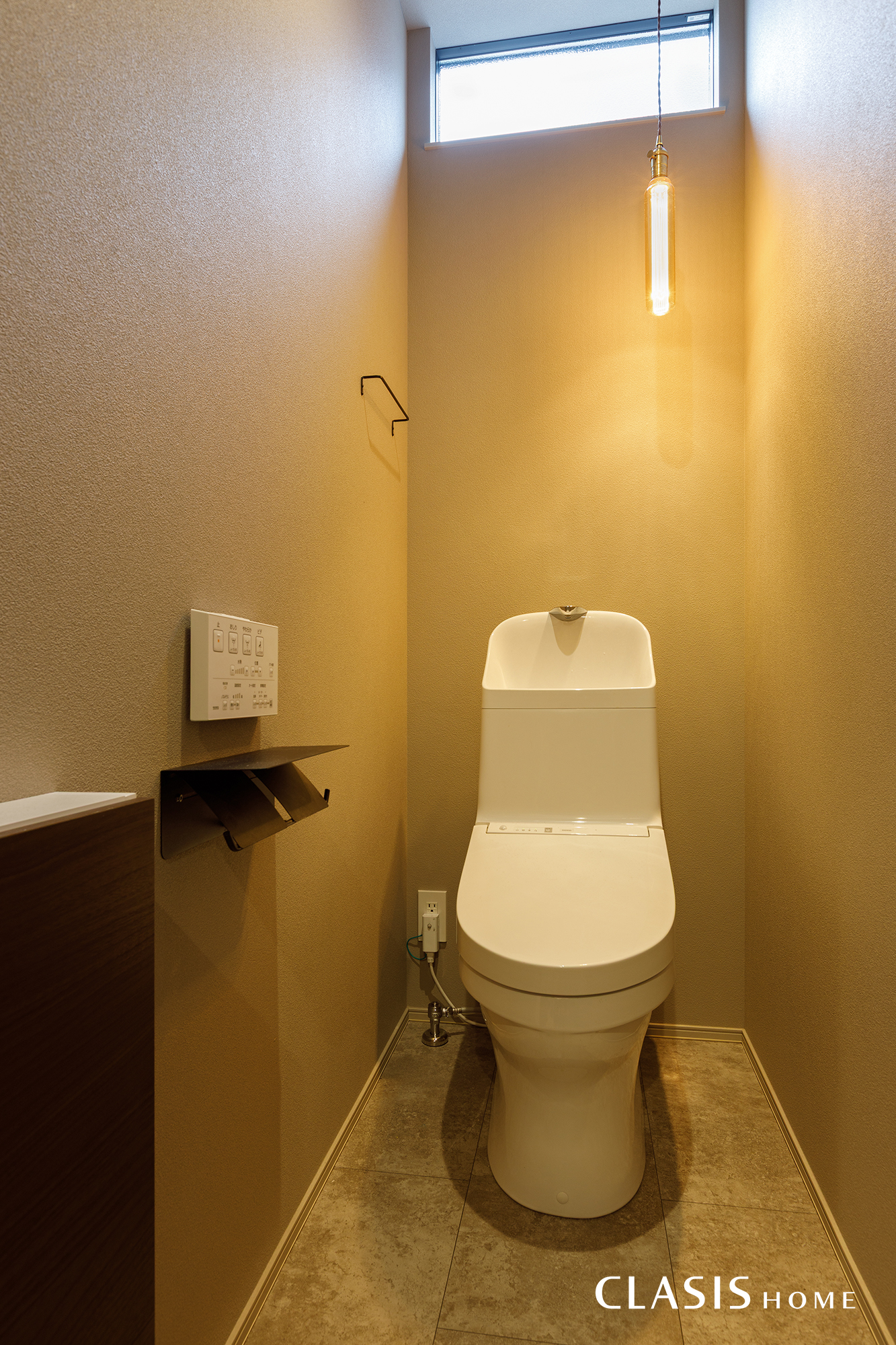 グレージュのクロスとコンクリート調の床材を組み合わせ、落ち着いたトーンで統一したトイレ。色味を抑えたコーディネートが、シンプルながらも洗練されたモダンな雰囲気を演出しています。