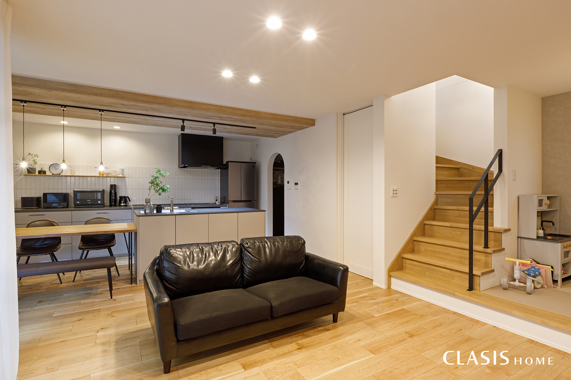 キッチンからリビング、畳コーナーまで見渡せる配置。家事をしながらでもご家族の様子を感じられる、つながりのある空間としています。リビング階段を採用し、日常の中で自然とコミュニケーションが生まれるよう計画しました。