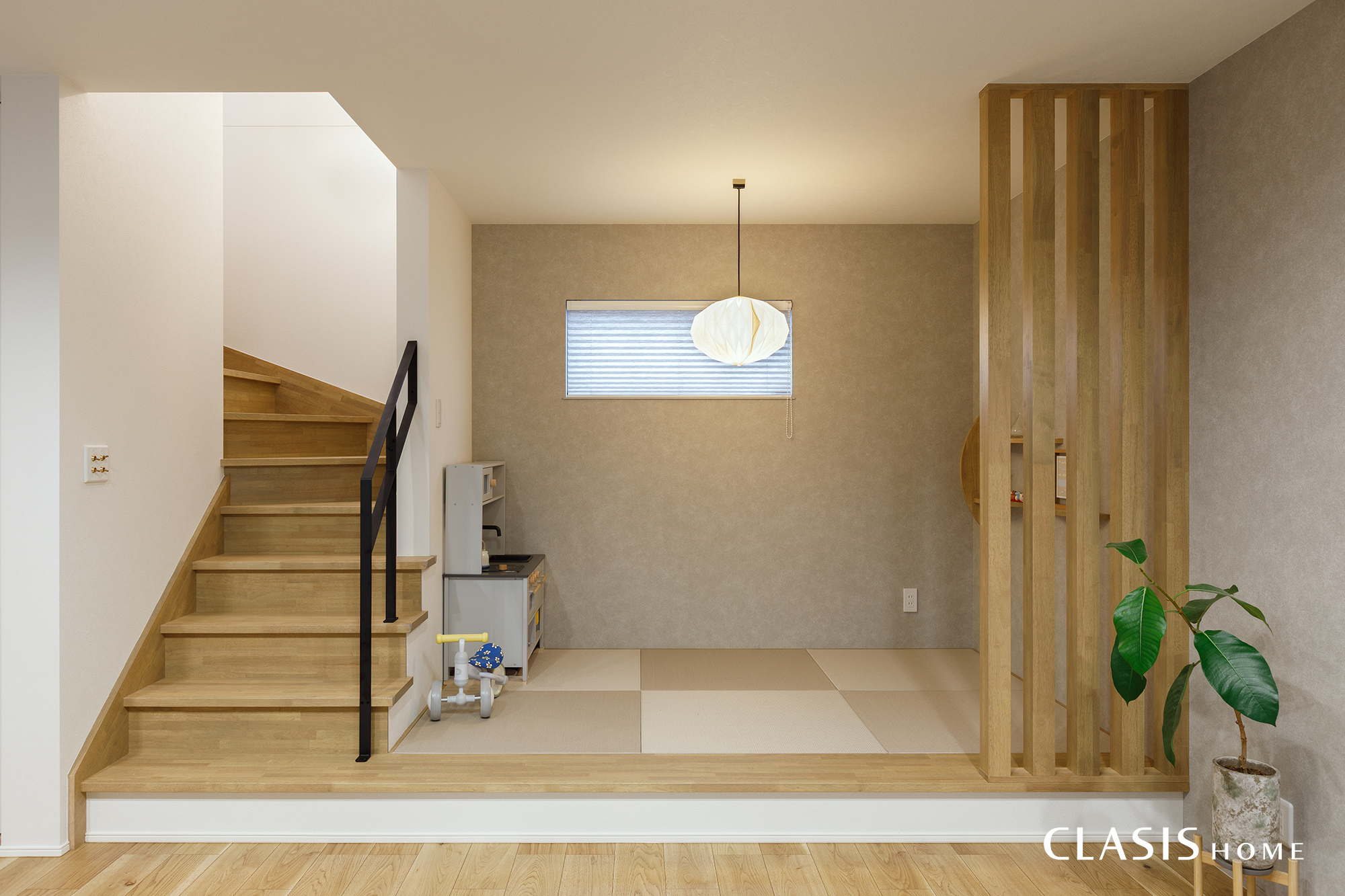 階段の1段目と小上がりの畳コーナーを連続させ、一体感のある納まりに。リビングとの間には格子を設け、やわらかく空間を区切っています。階段の一部にはアイアン手すりを採用し、空間のアクセントを加えました。