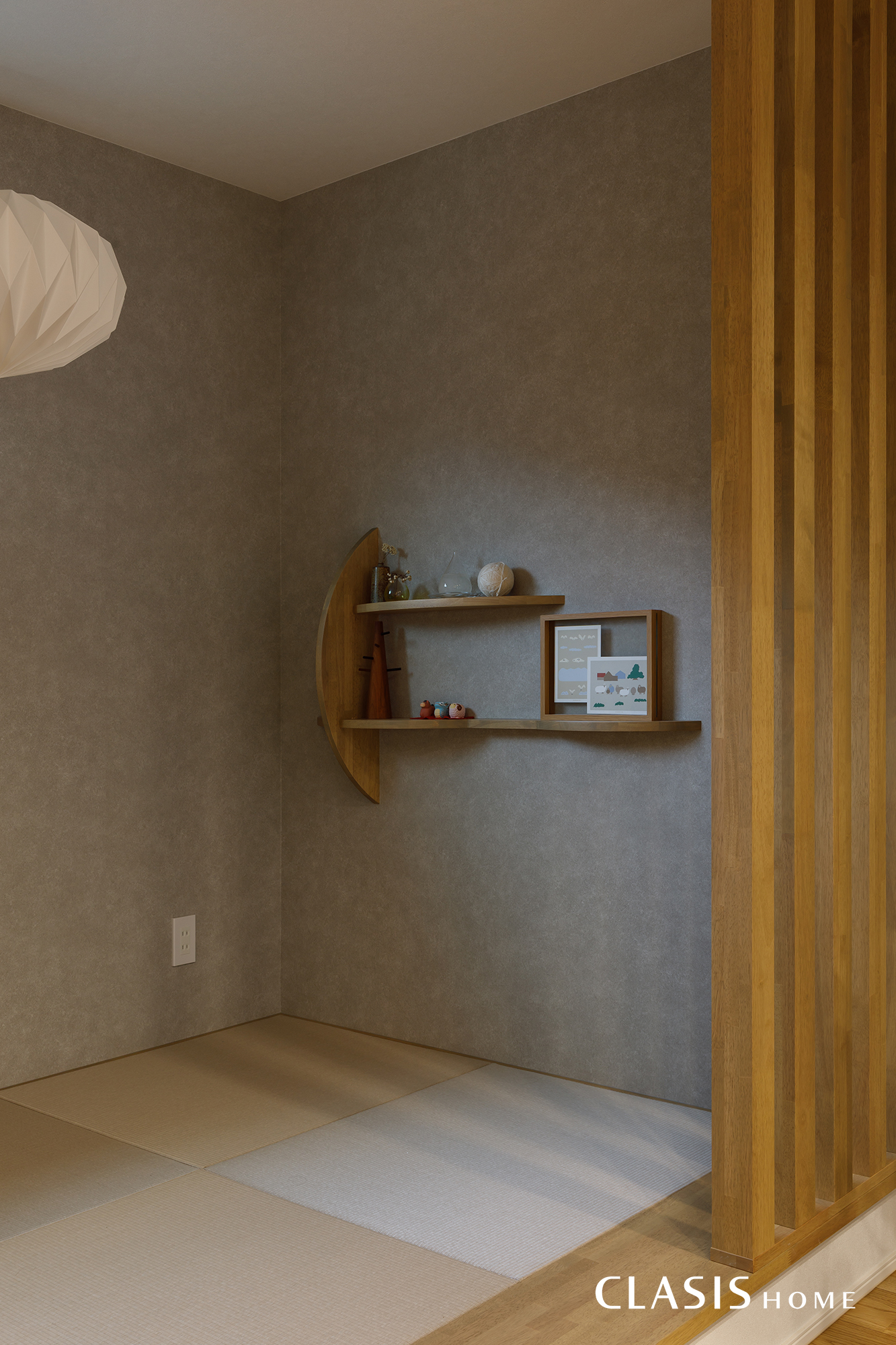 畳コーナーの一角に設けた飾り棚。岐阜店モデルハウスA棟のデザインを参考に、空間のアクセントとして取り入れました。