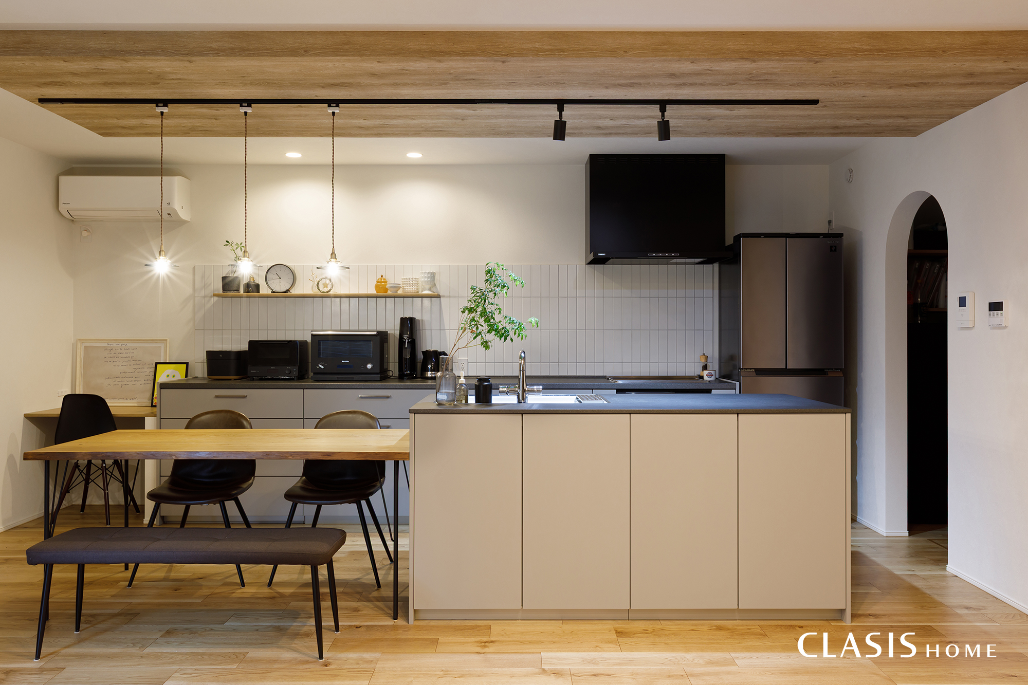 セパレートタイプのⅡ型キッチンと、配膳がしやすい横並びのダイニングを組み合わせた機能的な空間。木目調の下がり天井がキッチンエリアをゆるやかに区切り、背面にはレトロな釉薬の風合いが美しいクラフトタイルを縦貼りで仕上げました。