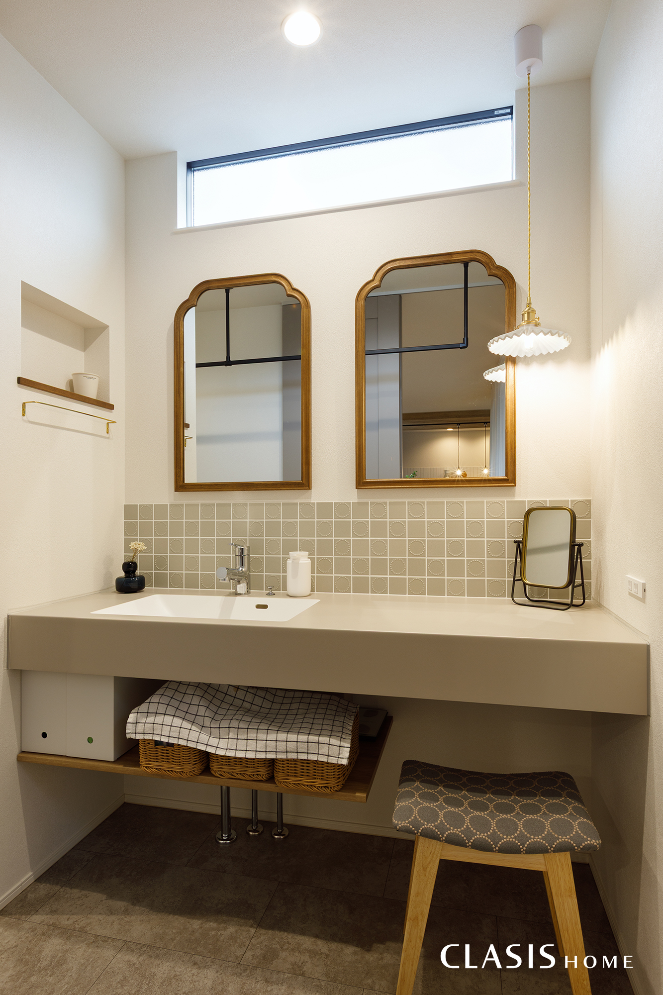 2人並んでもゆとりのある広さを確保した洗面台。洗面横にはニッチを設け、使い勝手とデザイン性を両立させています。お施主様こだわりの照明やミラー、タイルなどを取り入れ、細部まで丁寧に仕上げました。