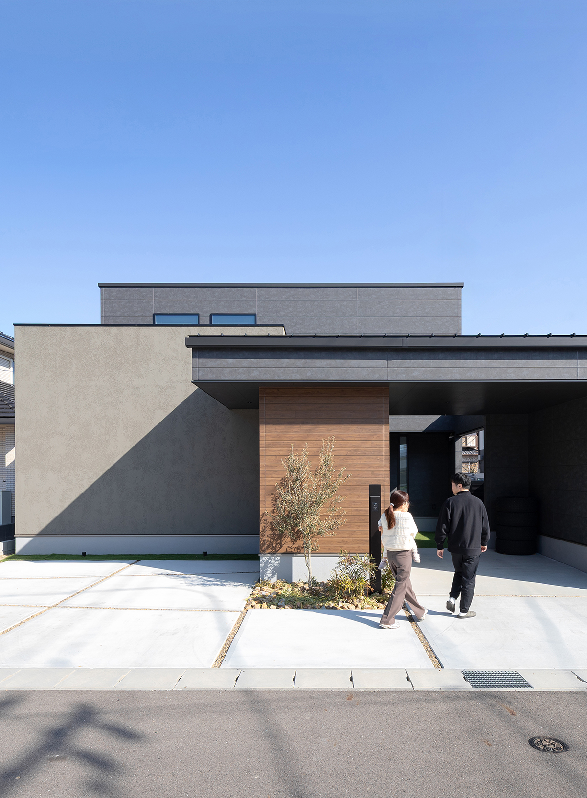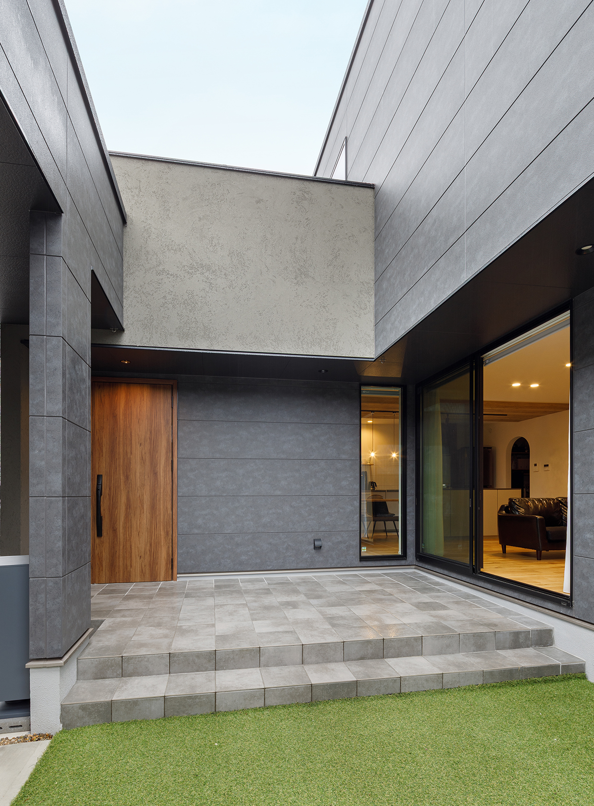 ガレージを目隠しとして活用し、プライバシーに配慮した中庭を計画。玄関ポーチとお庭のタイルデッキを連続させることで、広がりのある外部空間としました。玄関からリビングの掃き出し窓へと軒がつながり、一体感をもたせています。