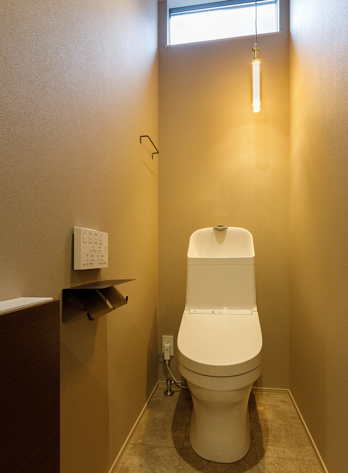 グレージュのクロスとコンクリート調の床材を組み合わせ、落ち着いたトーンで統一したトイレ。色味を抑えたコーディネートが、シンプルながらも洗練されたモダンな雰囲気を演出しています。