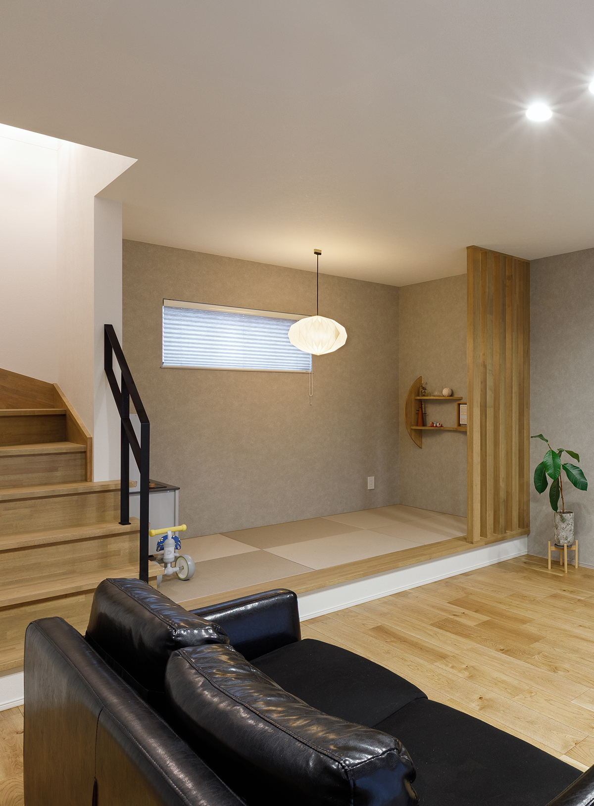 階段の1段目と小上がりの畳コーナーを連続させ、一体感のある納まりに。リビングとの間には格子を設け、やわらかく空間を区切っています。階段の一部にはアイアン手すりを採用し、空間のアクセントを加えました。