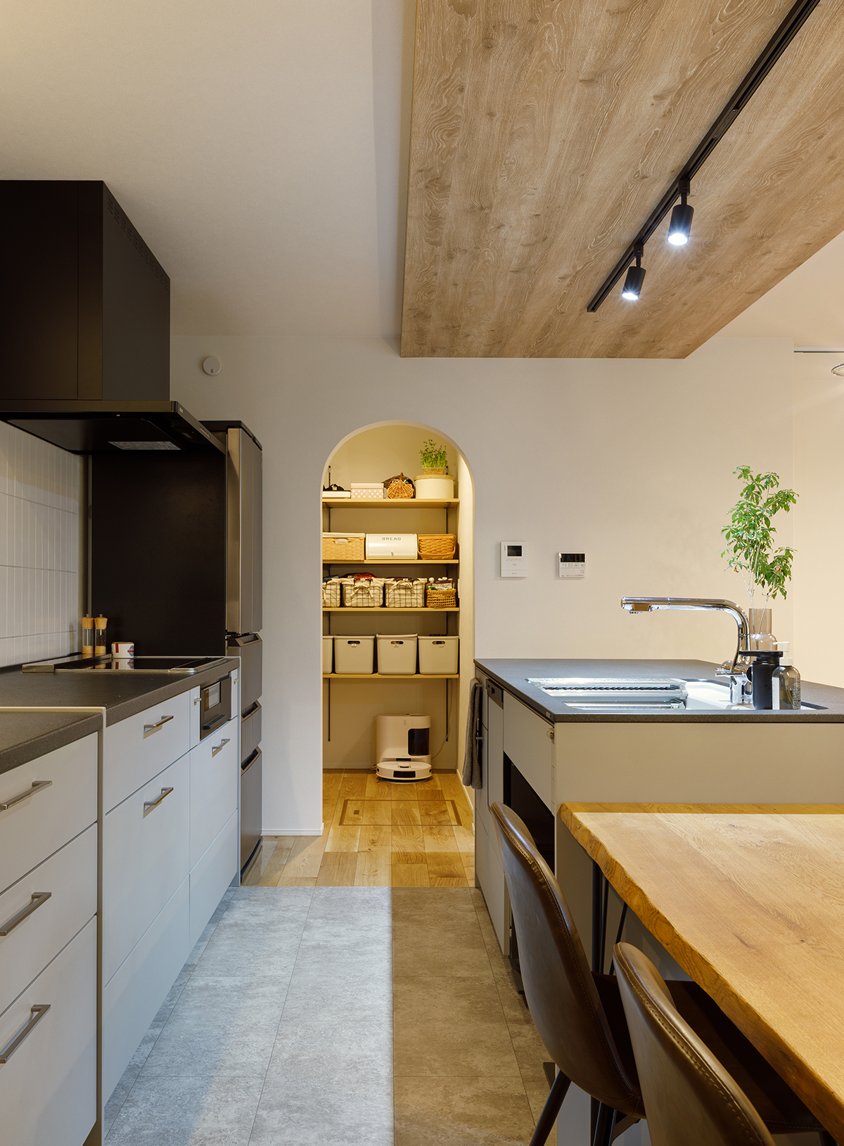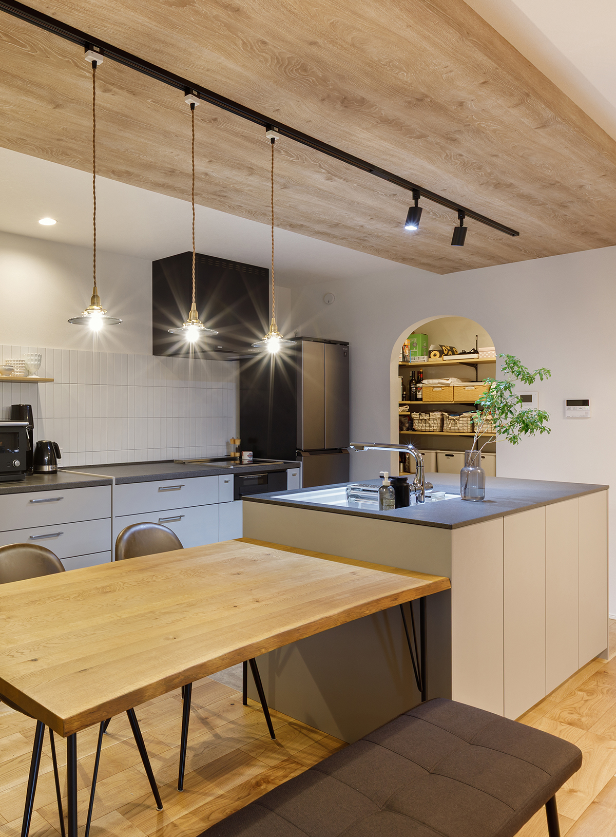 セパレートタイプのⅡ型キッチンと、配膳がしやすい横並びのダイニングを組み合わせた機能的な空間。木目調の下がり天井がキッチンエリアをゆるやかに区切り、背面にはレトロな釉薬の風合いが美しいクラフトタイルを縦貼りで仕上げました。
