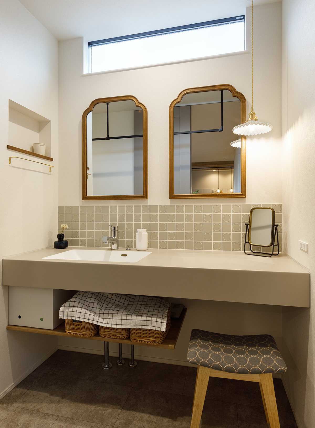2人並んでもゆとりのある広さを確保した洗面台。洗面横にはニッチを設け、使い勝手とデザイン性を両立させています。お施主様こだわりの照明やミラー、タイルなどを取り入れ、細部まで丁寧に仕上げました。