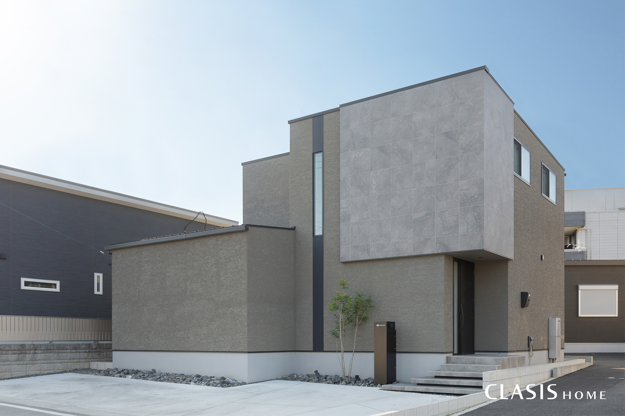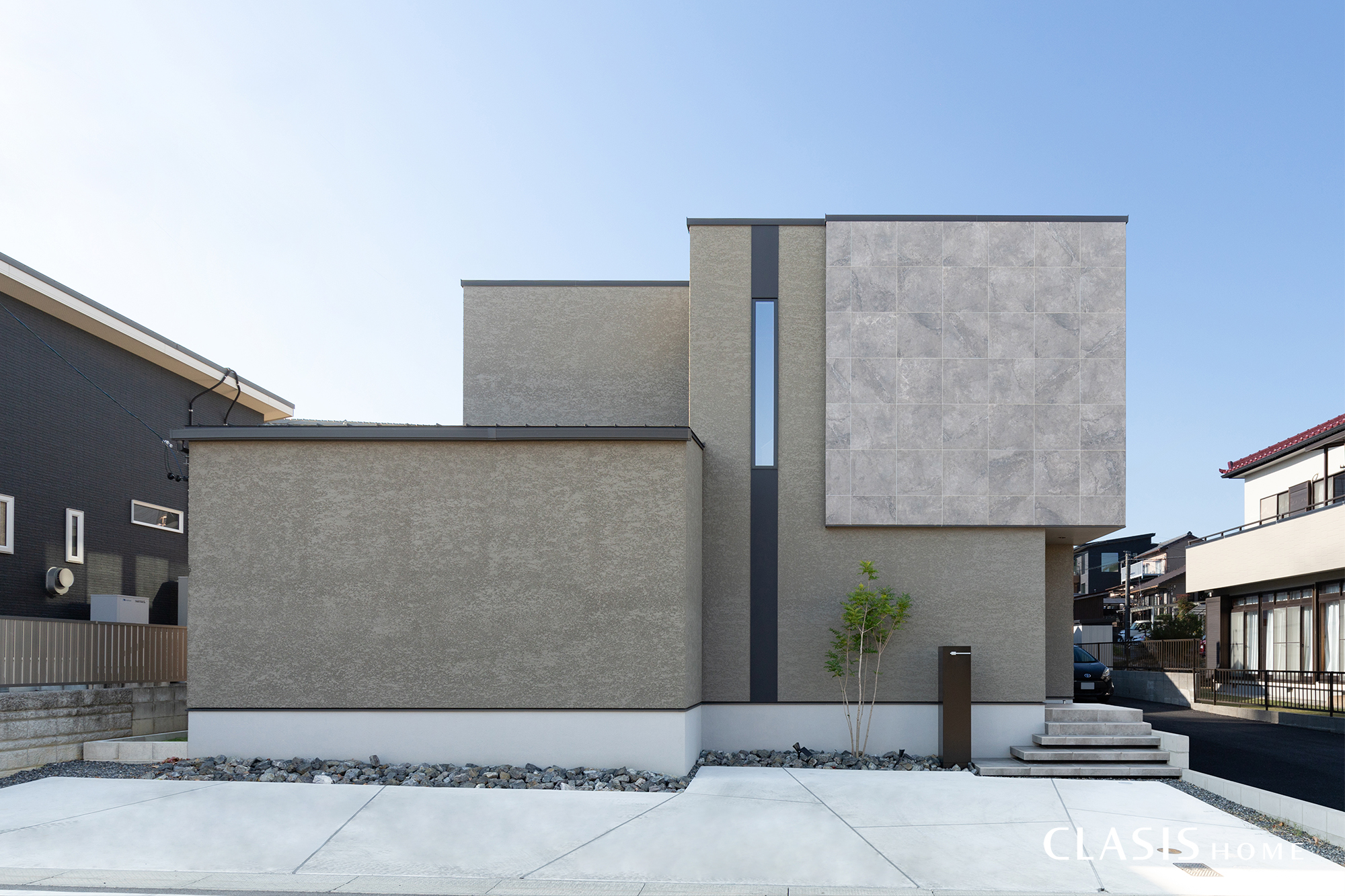 グレーの塗り壁をベースに、異素材を組み合わせて奥行きを出した洗練された外観。道路からの視線を遮る閉じた外観にしつつ、縦長のスリット窓を配置しました。プライバシーを確保しながら、内部へ柔らかい光を届ける設計としています。