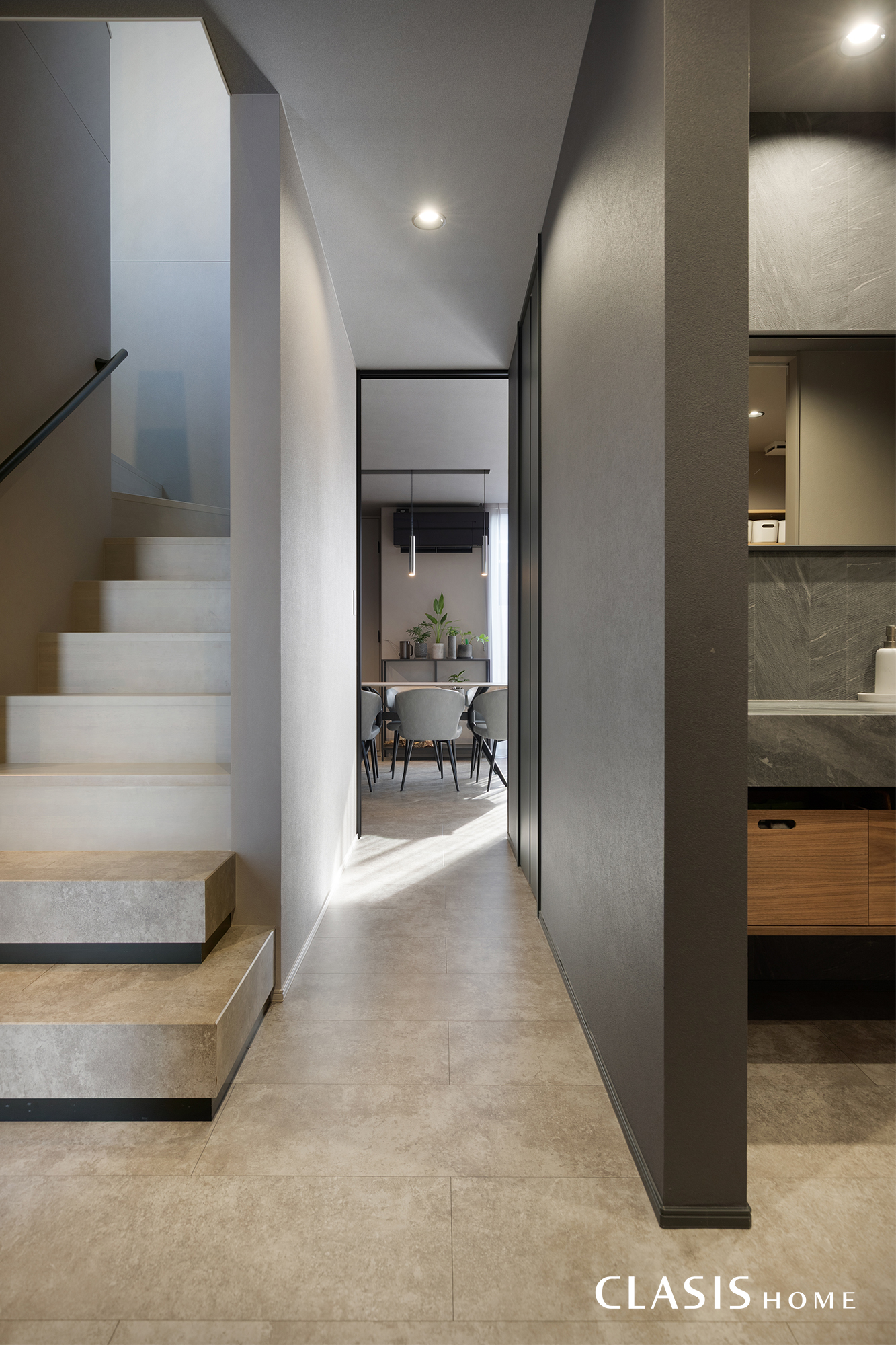 ホールや廊下など、動線となる空間にも妥協せず、ホテルライクなイメ―ジを大切にコーディネートを行いました。階段はあえて全体を目立たせるのではなく、ベースとなる部分は壁面と色を合わせることで、スッキリと広く見せるようなバランスに仕上げています。