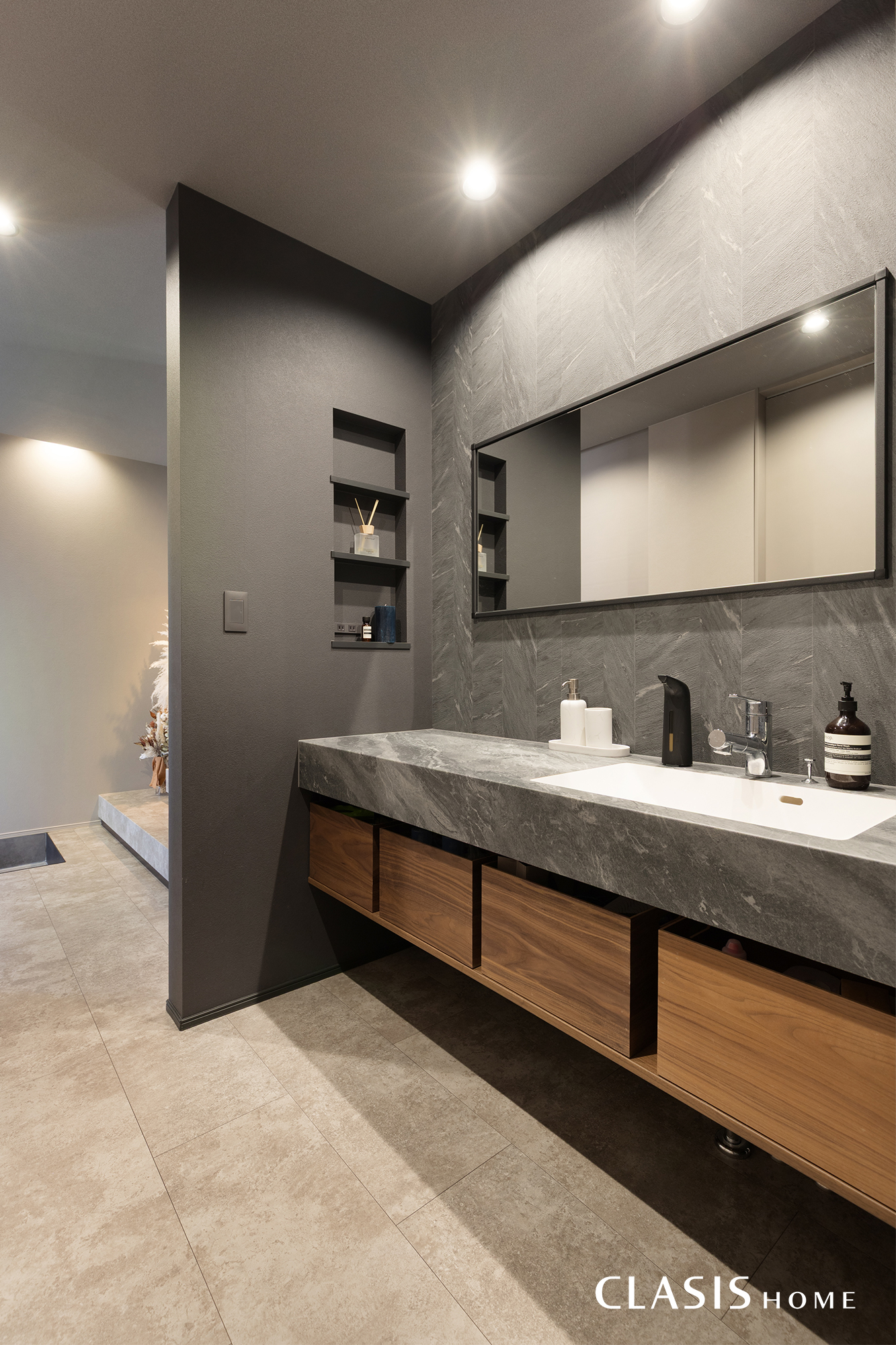 玄関ホールに設けたオープンな造作洗面台。グレーの石目調カウンターに木目の収納を組み合わせ、重厚感と温かみを両立させました。壁面に設けたニッチは、小物を整理しつつ空間のアクセントとしても機能します。
