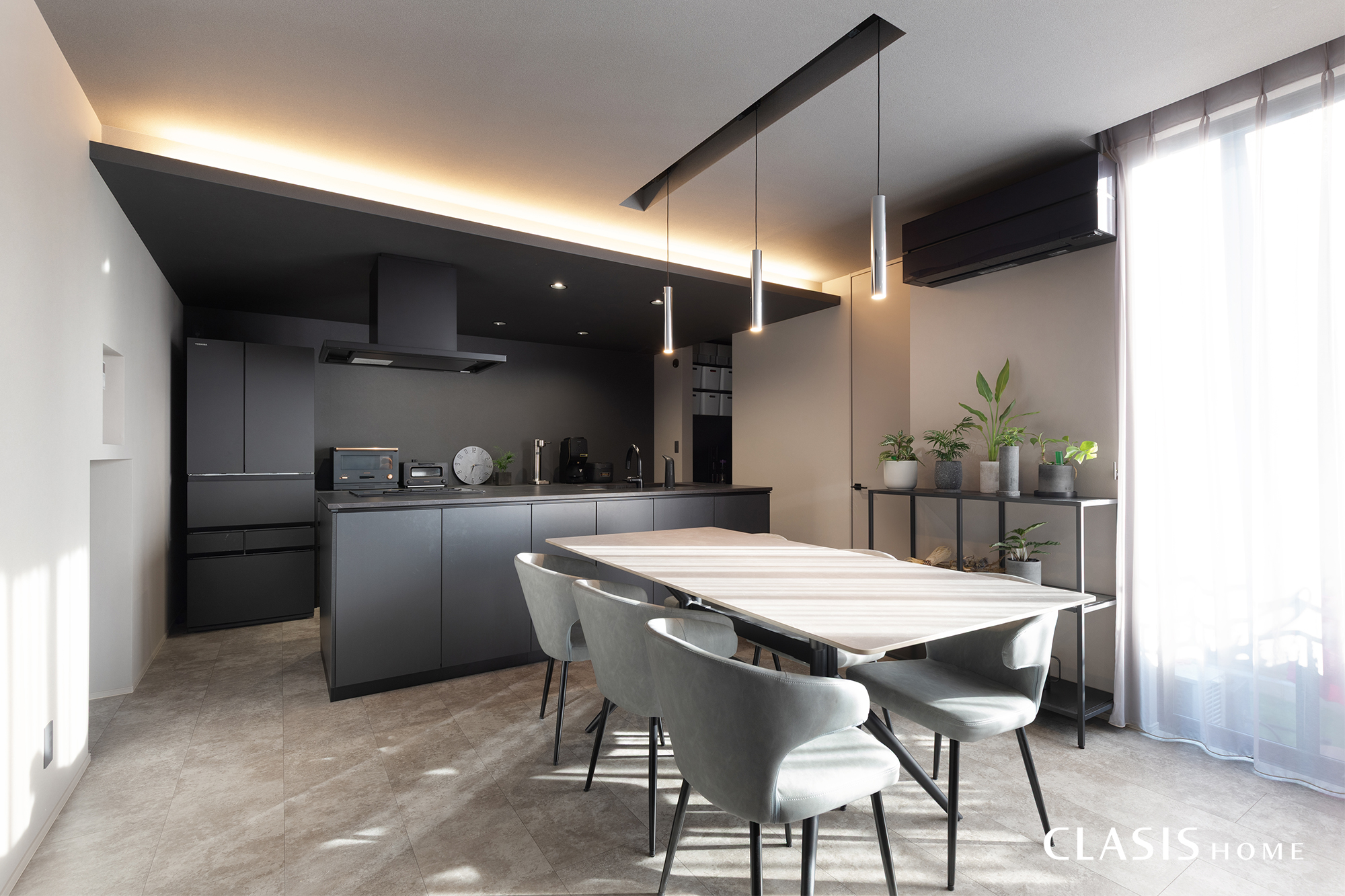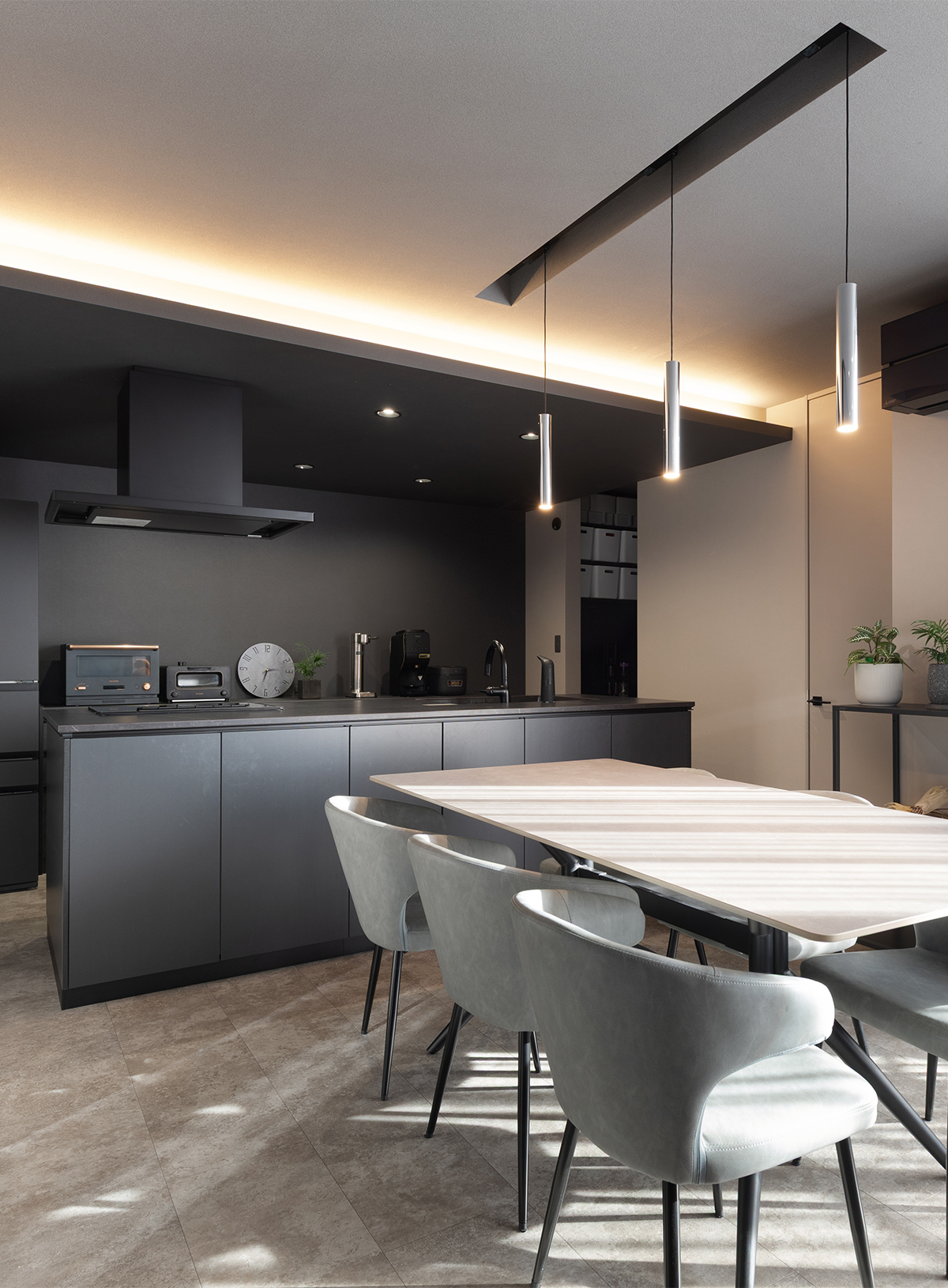 ブラックのキッチンを主役に、背面壁も同色で揃えて奥行き感を強調しました。空間が重たくなりすぎないよう、折下げ天井に間接照明を配置。グレージュを基調とした空間に、ダークトーンの質感がシャープなアクセントを加えています。