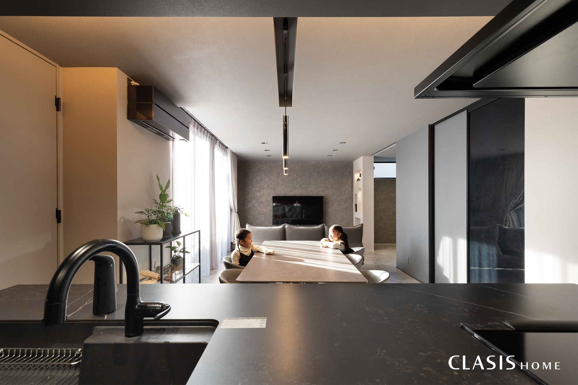 キッチンからリビングまで一直線に視線が抜ける開放的なレイアウトが、洗練された空間の中に家族との繋がりや温かみを生み出します。