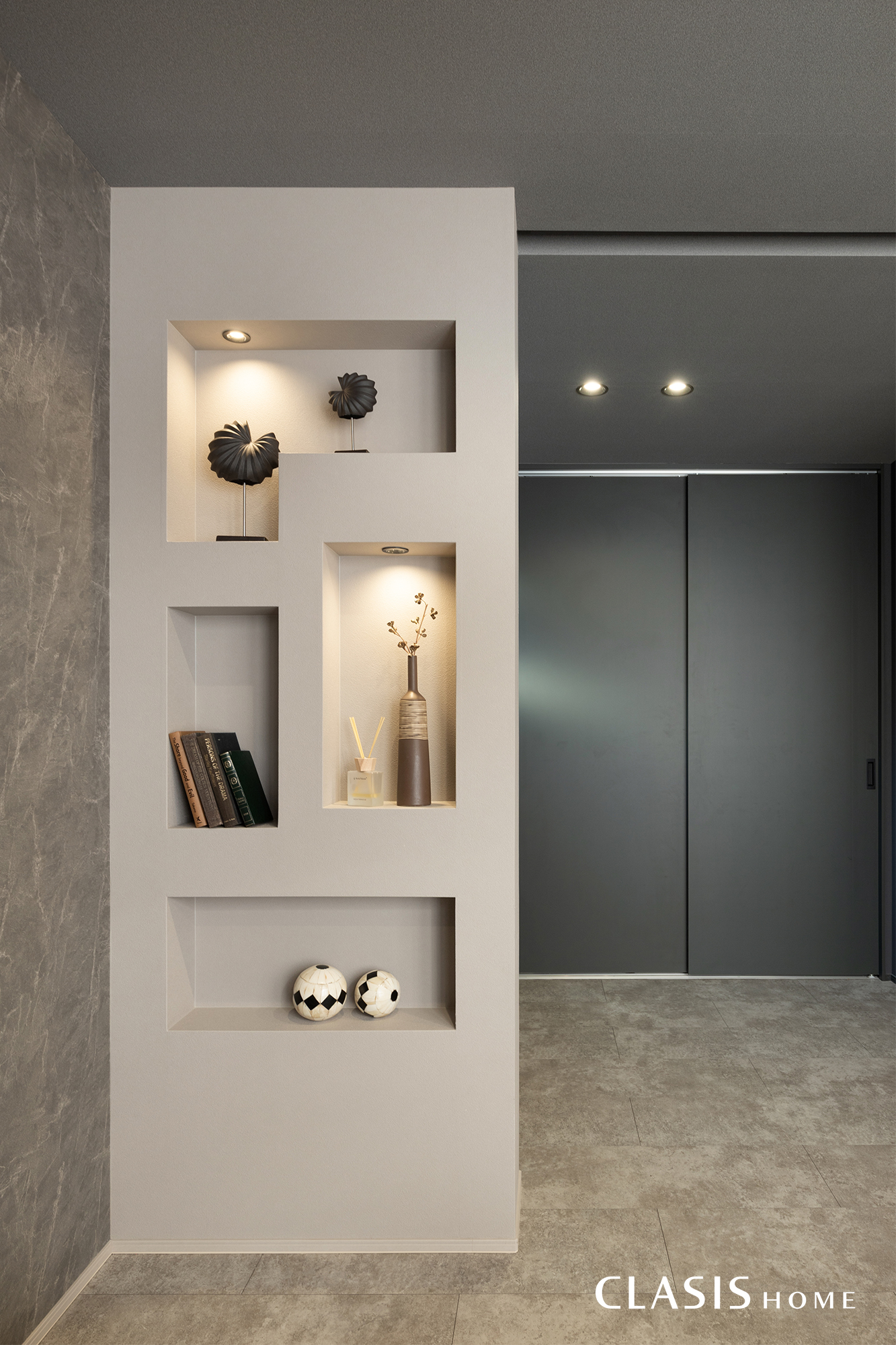 ニッチ部分は、ダウンライトが小物のシルエットを浮き上がらせる、ギャラリーのような仕上がりです。