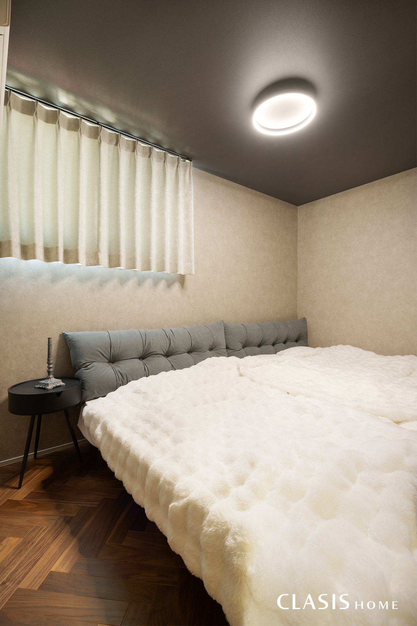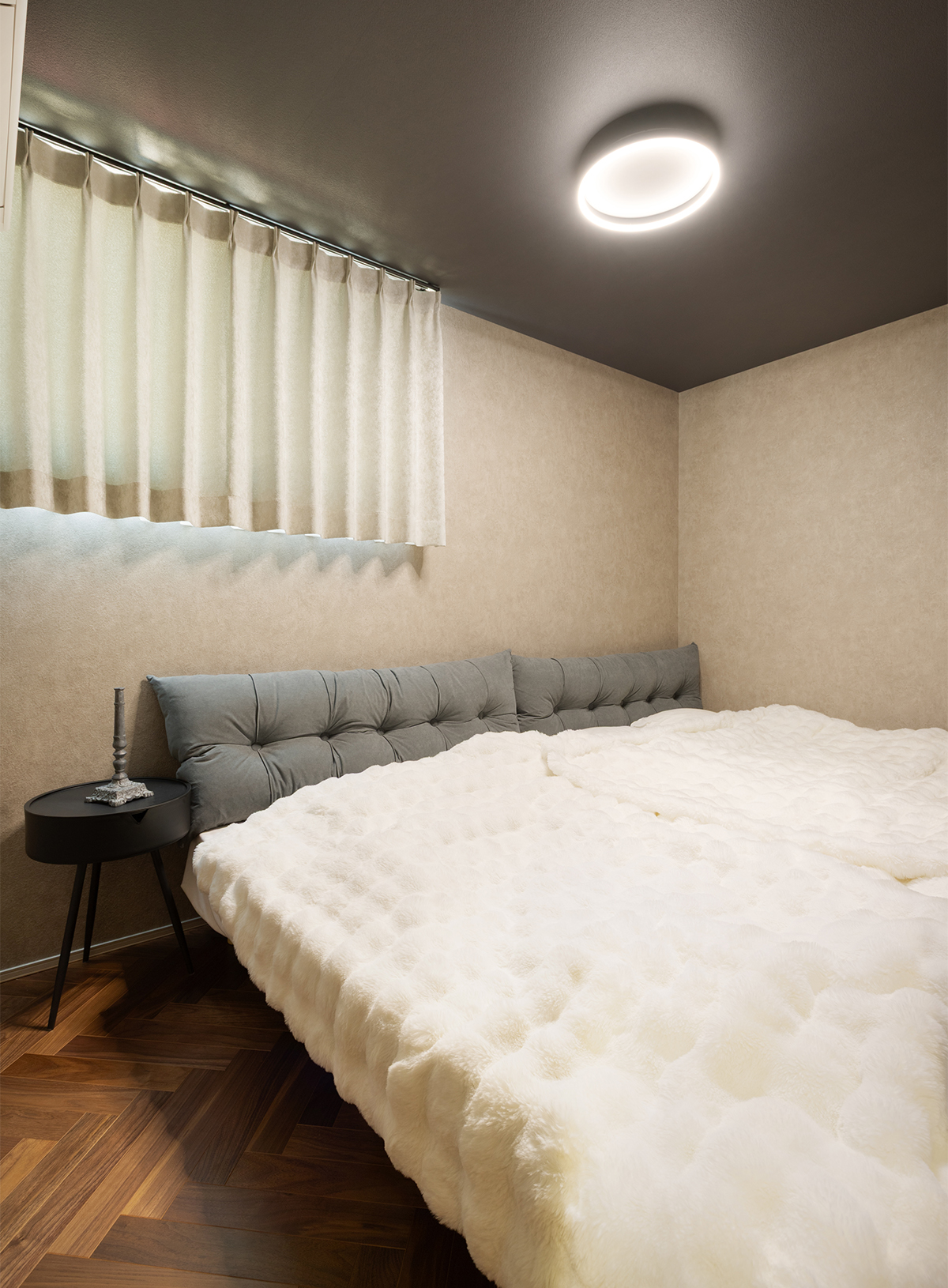 ヘリンボーンの床がクラシックな気品を添える寝室。天井をダークトーンのクロスにすることで、心地よい眠りを誘う落ち着いた空間に仕上げました。