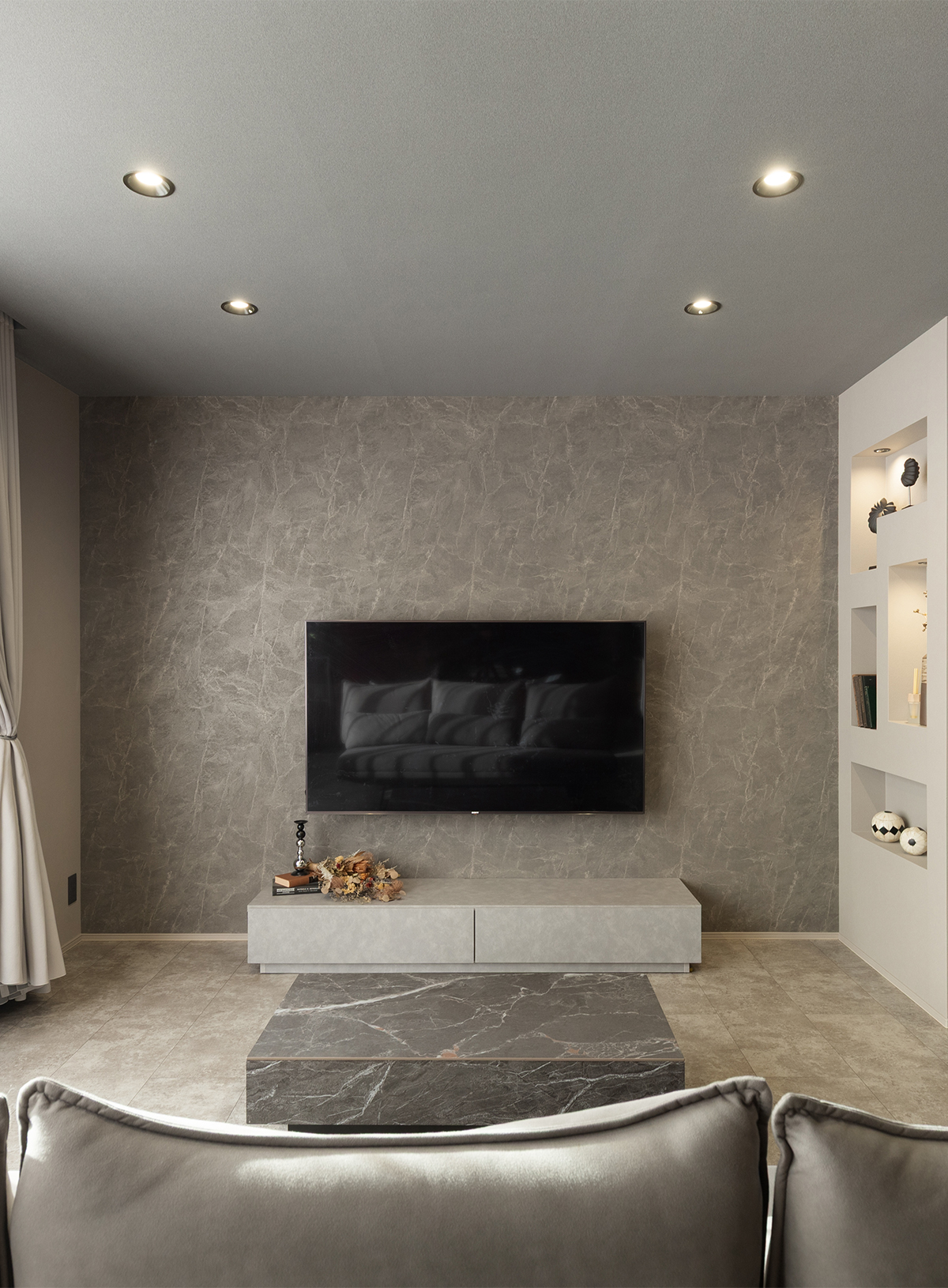 ニュアンスグレーの柔らかなトーンで統一された、ホテルライクな寛ぎを表現したLDK。TV背面には、お施主様こだわりの特殊なクロスを施し、空間に上質な奥行きを与えました。サイドの間仕切り壁には意匠を凝らしたニッチを設け、生活感を感じさせない洗練された空間構成としています。