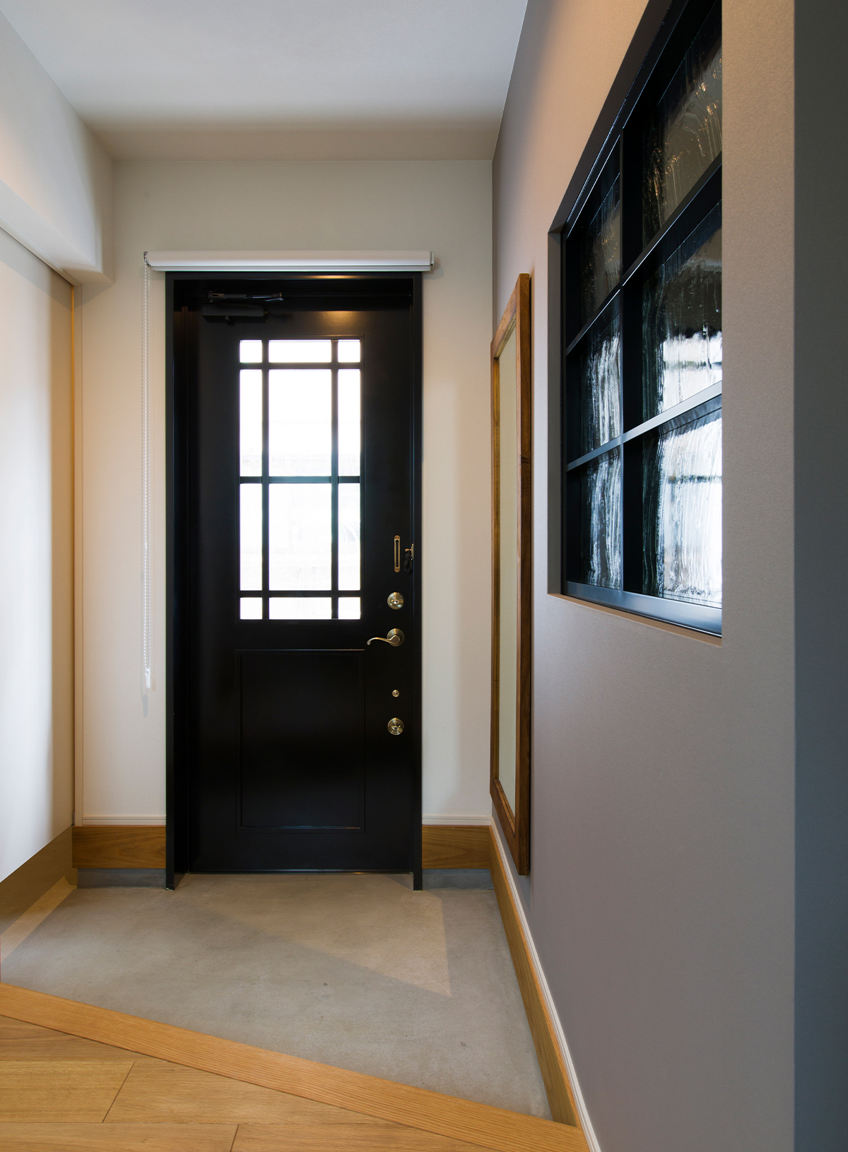 木製の黒い玄関ドアは造作。グレーと白絵お基調とした空間をぐっと引き締めています。