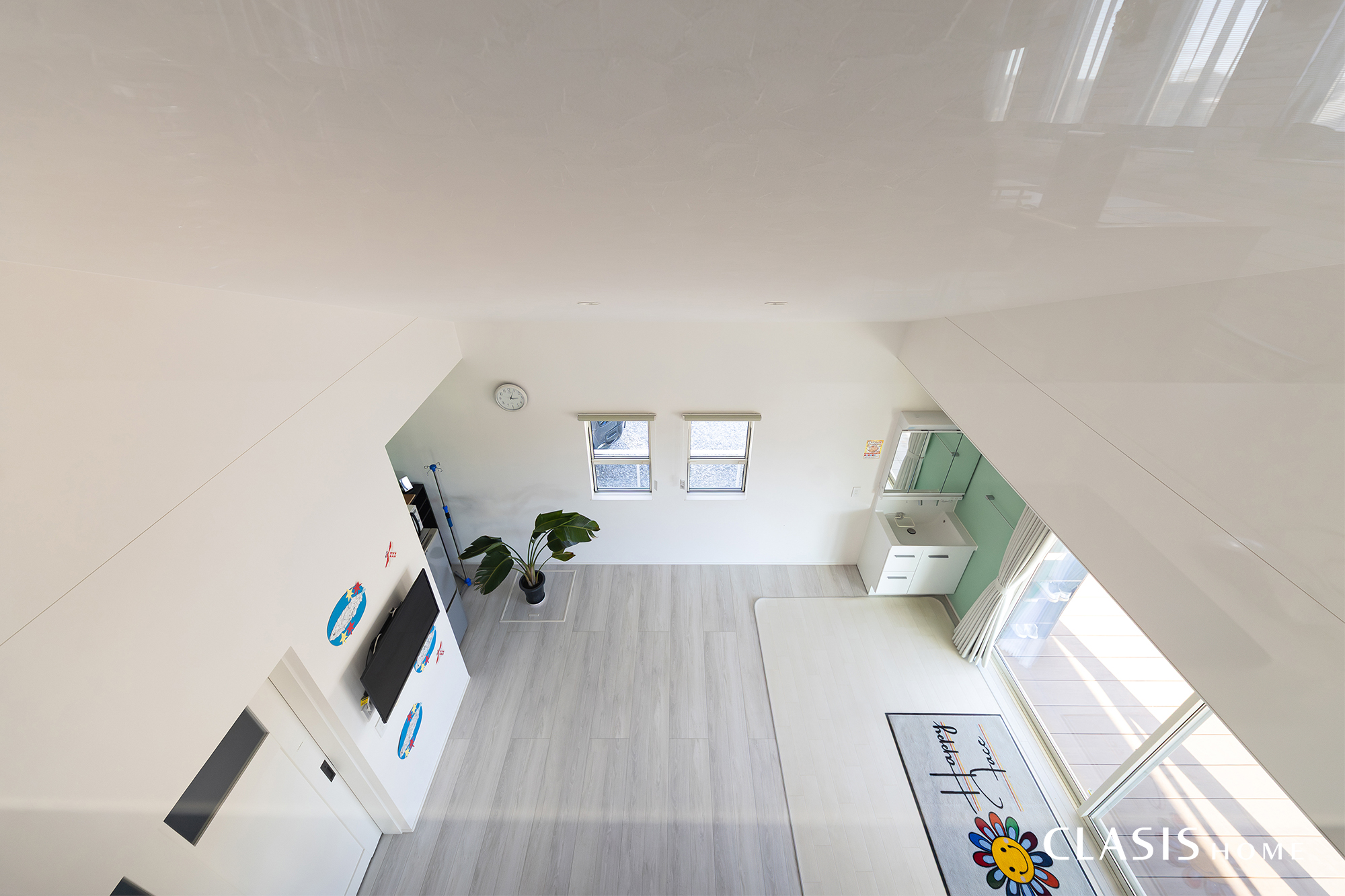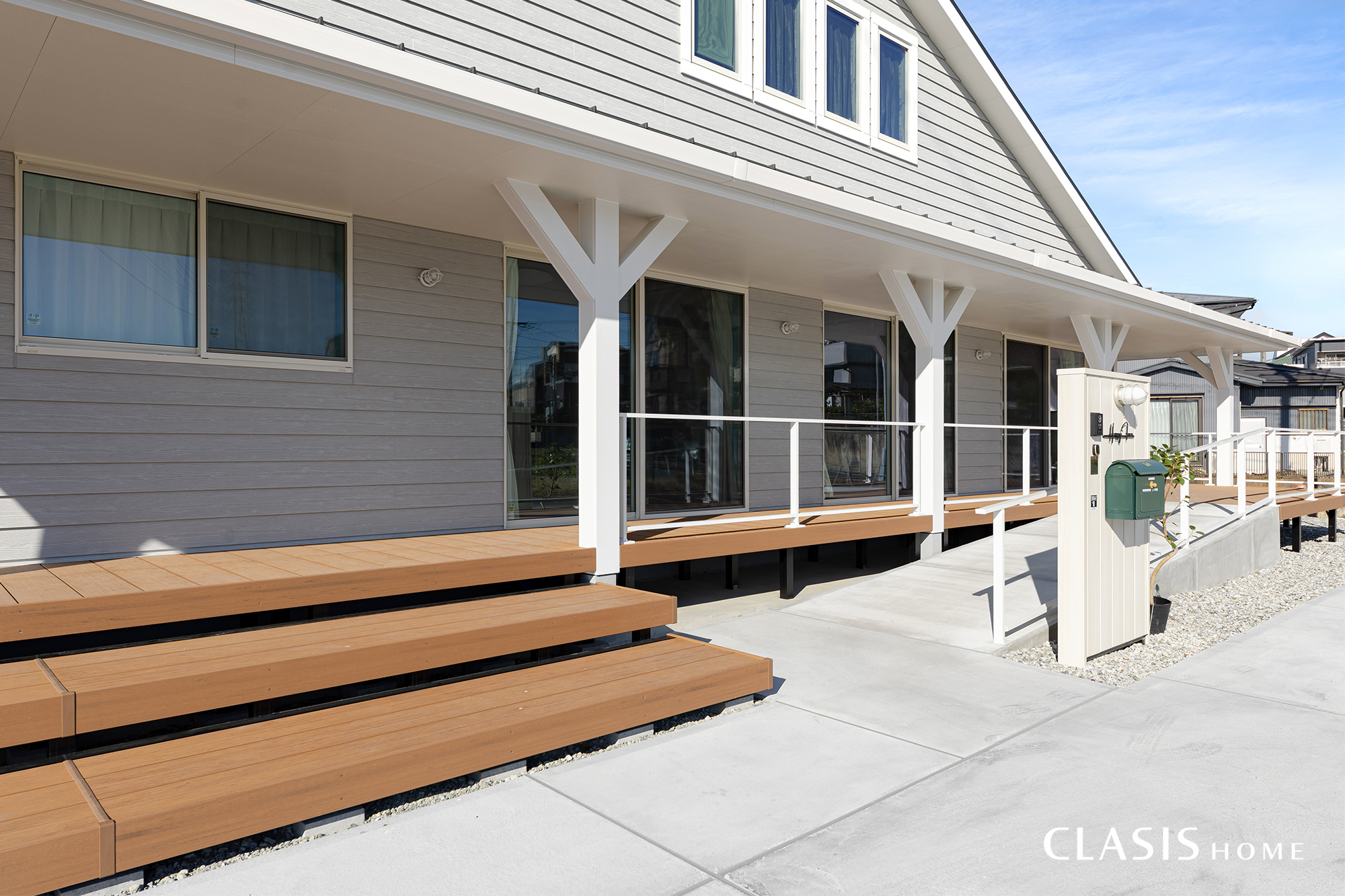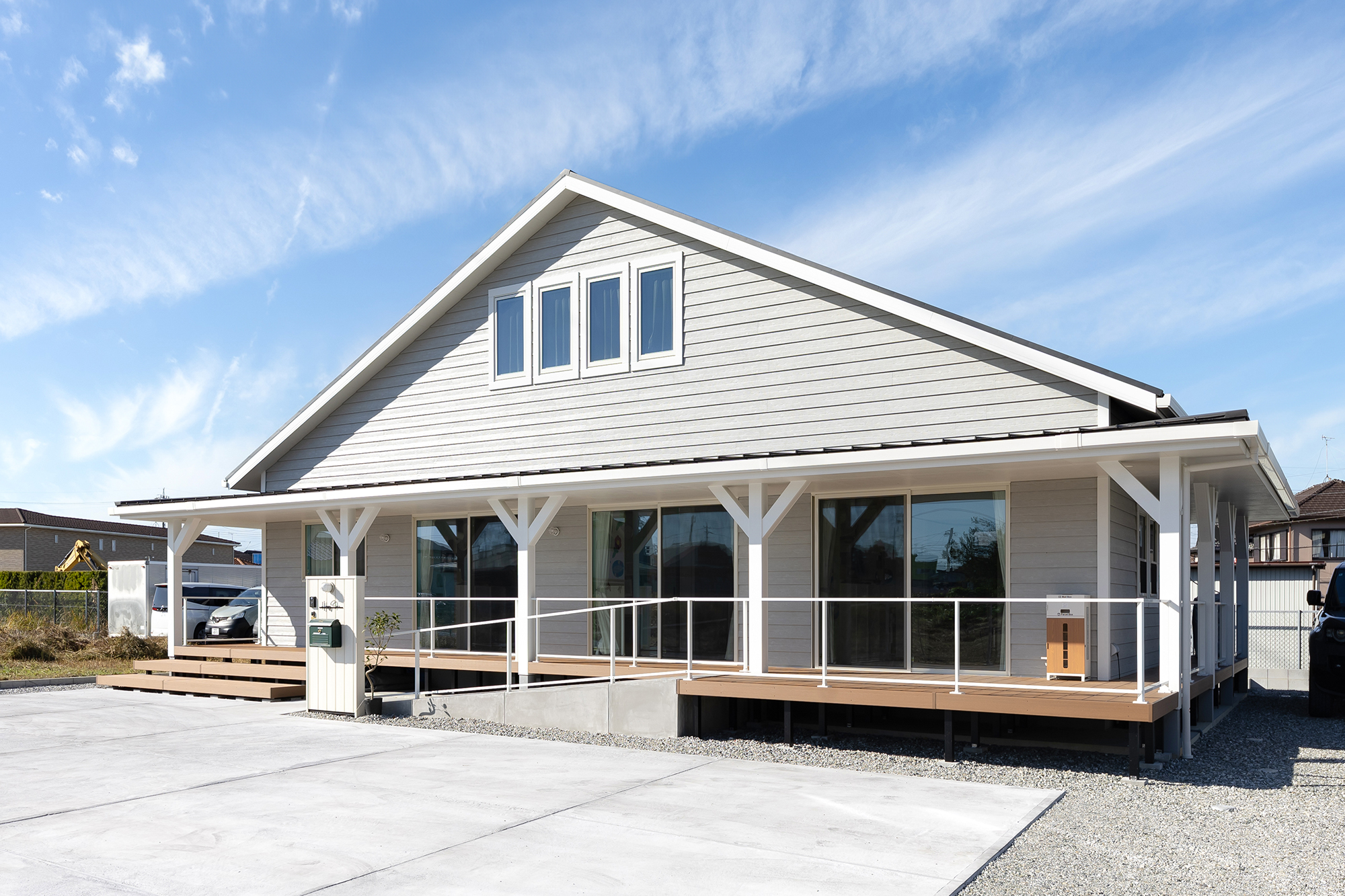 ライトグレーのラップサイディングと白のコントラストが、アメリカ西海岸のような開放的な雰囲気を作り出し、訪れる人を明るく穏やかな気持ちで迎えてくれます。
