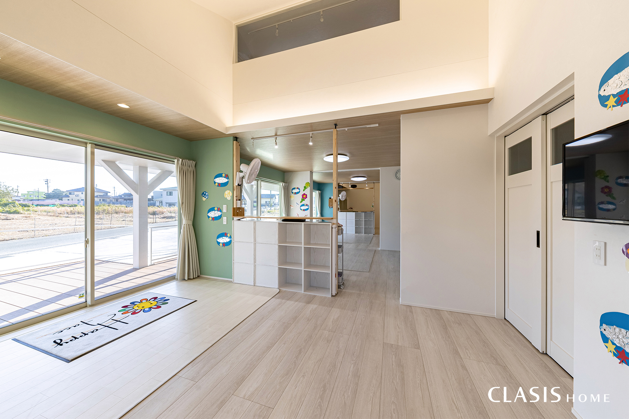 建物の間口が広く、各部屋がカバードポーチに面しているため、どの部屋も開放的な空間になっています。温かな日の光を感じながらほっこりと過ごせるようなイメージで設計しました。