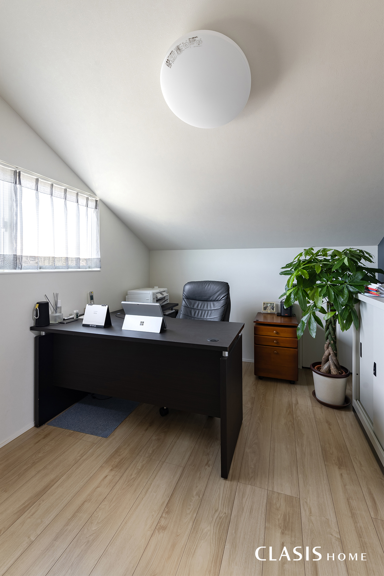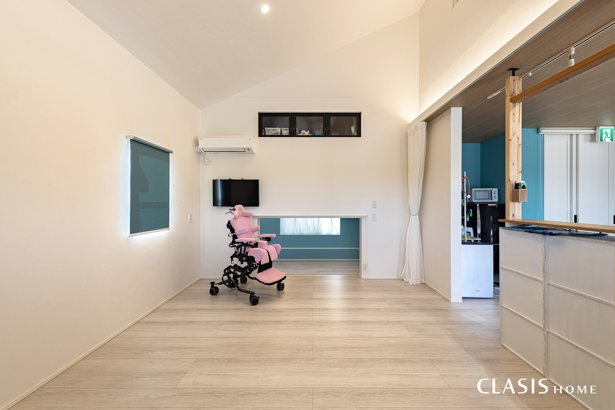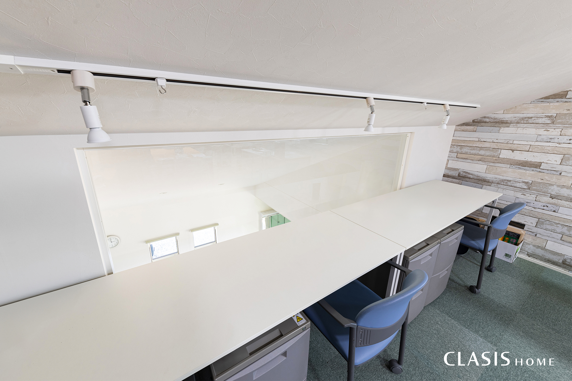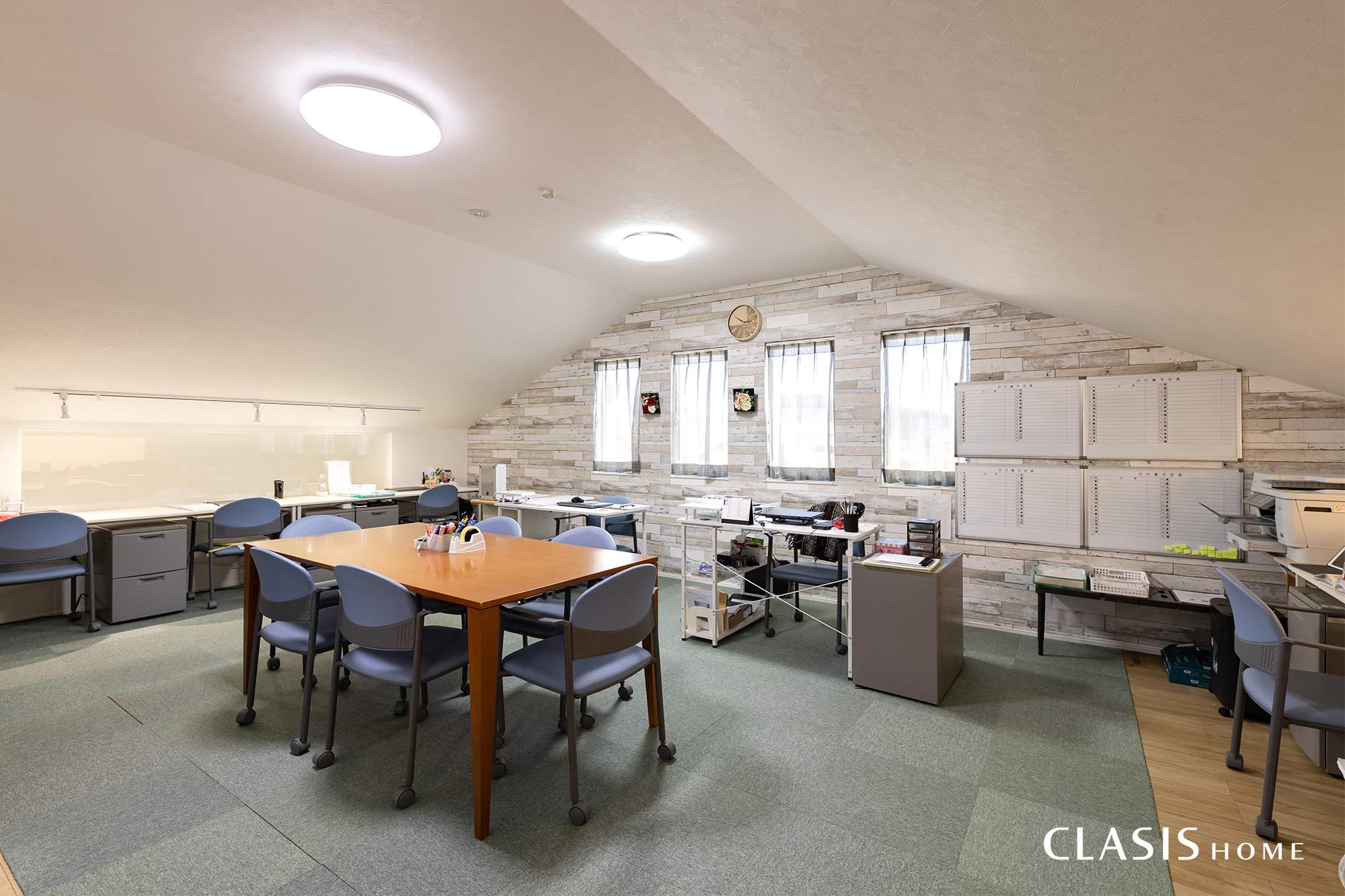 一見すると平屋のようにも見えますが、屋根裏の2階部分にはスタッフルームを用意しています。机から1階をすぐに覗けるようになっているので、事務仕事をしながらも様子を見たり、スタッフの方々同士で声をかけあったりなども可能です。