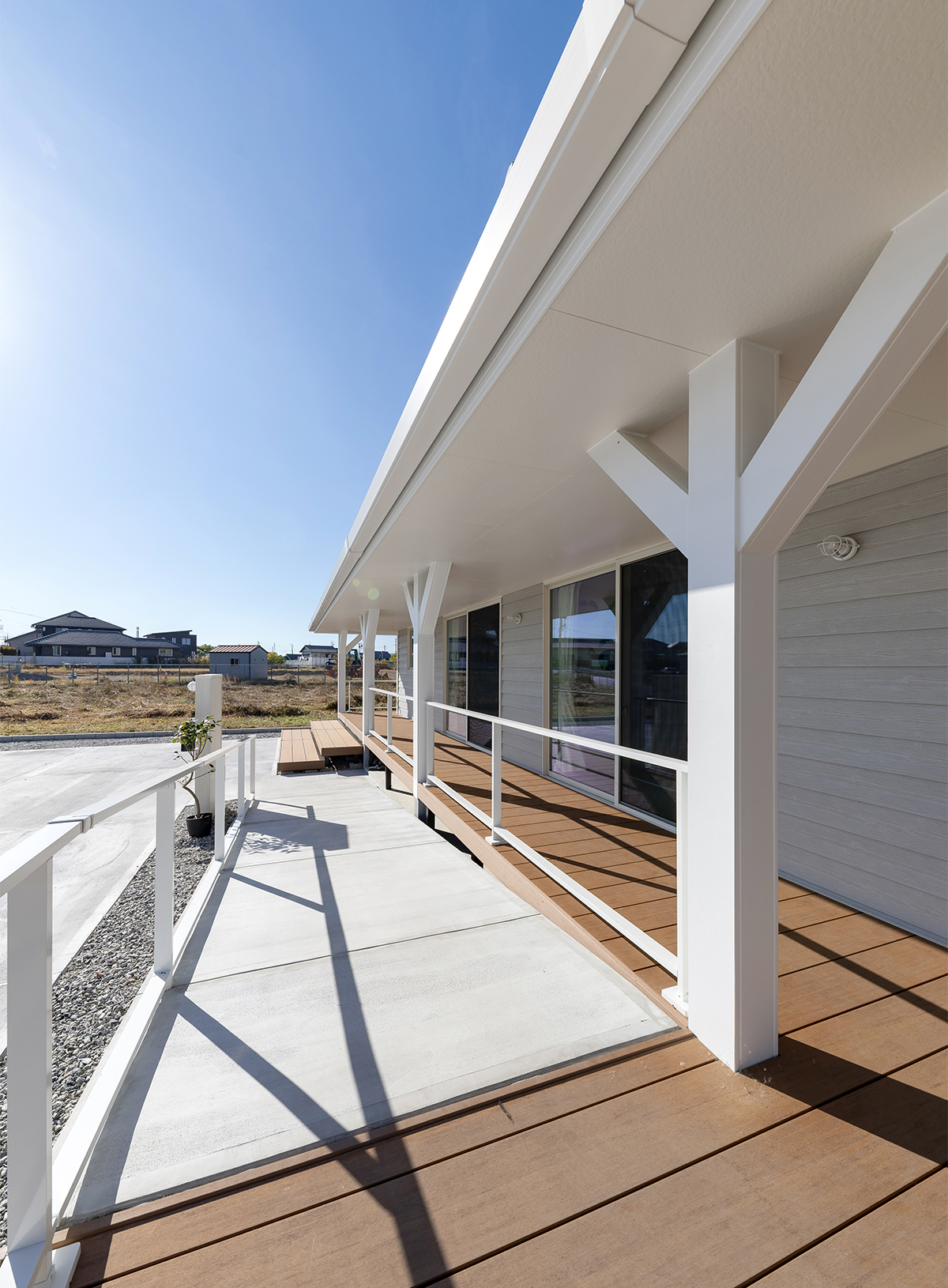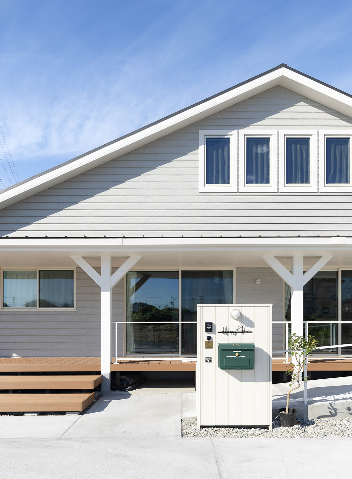 ライトグレーのラップサイディングと白のコントラストが、アメリカ西海岸のような開放的な雰囲気を作り出し、訪れる人を明るく穏やかな気持ちで迎えてくれます。