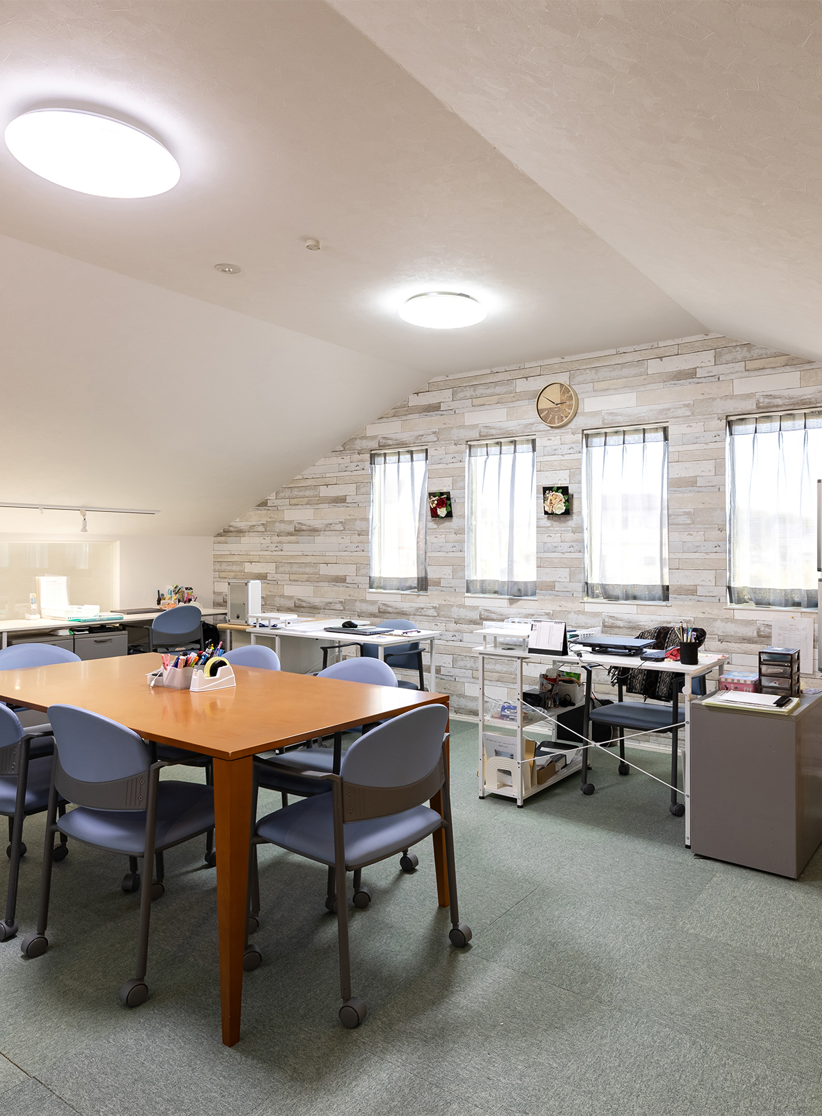 一見すると平屋のようにも見えますが、屋根裏の2階部分にはスタッフルームを用意しています。机から1階をすぐに覗けるようになっているので、事務仕事をしながらも様子を見たり、スタッフの方々同士で声をかけあったりなども可能です。