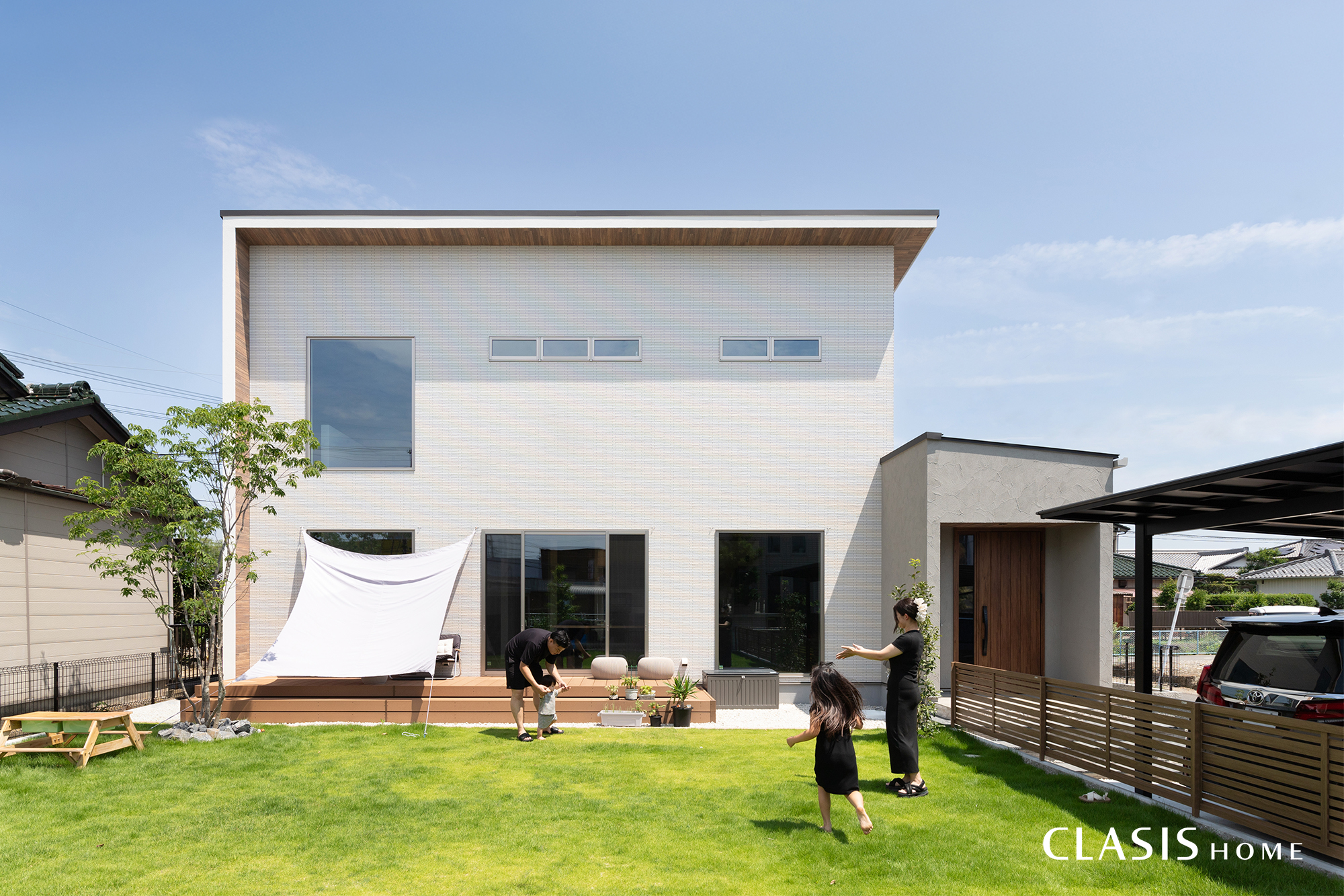 建物のサイド部分、南側には広々としたお庭を設けました。カーポートやフェンスで道路側からの視線は遮っているため、天気の良い日には家族みんなでリラックスして過ごせそうです。