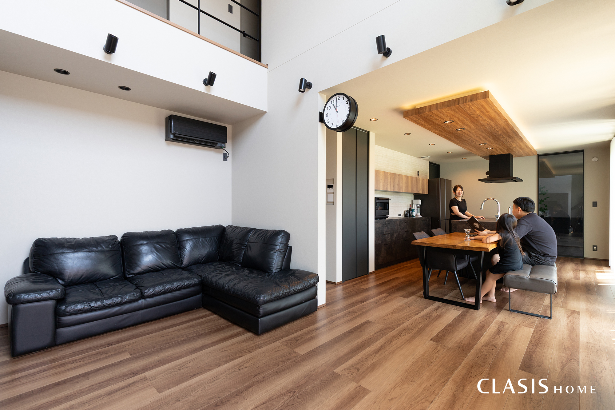 LDKは開放感のある吹き抜けと落ち着きのあるカラーリングで、のびのびと過ごせるような空間に仕上げました。表し梁や天井の木目、テレビ面のふかし壁など、アクセントクロスの貼り分けで豊かな素材感を表現しています。