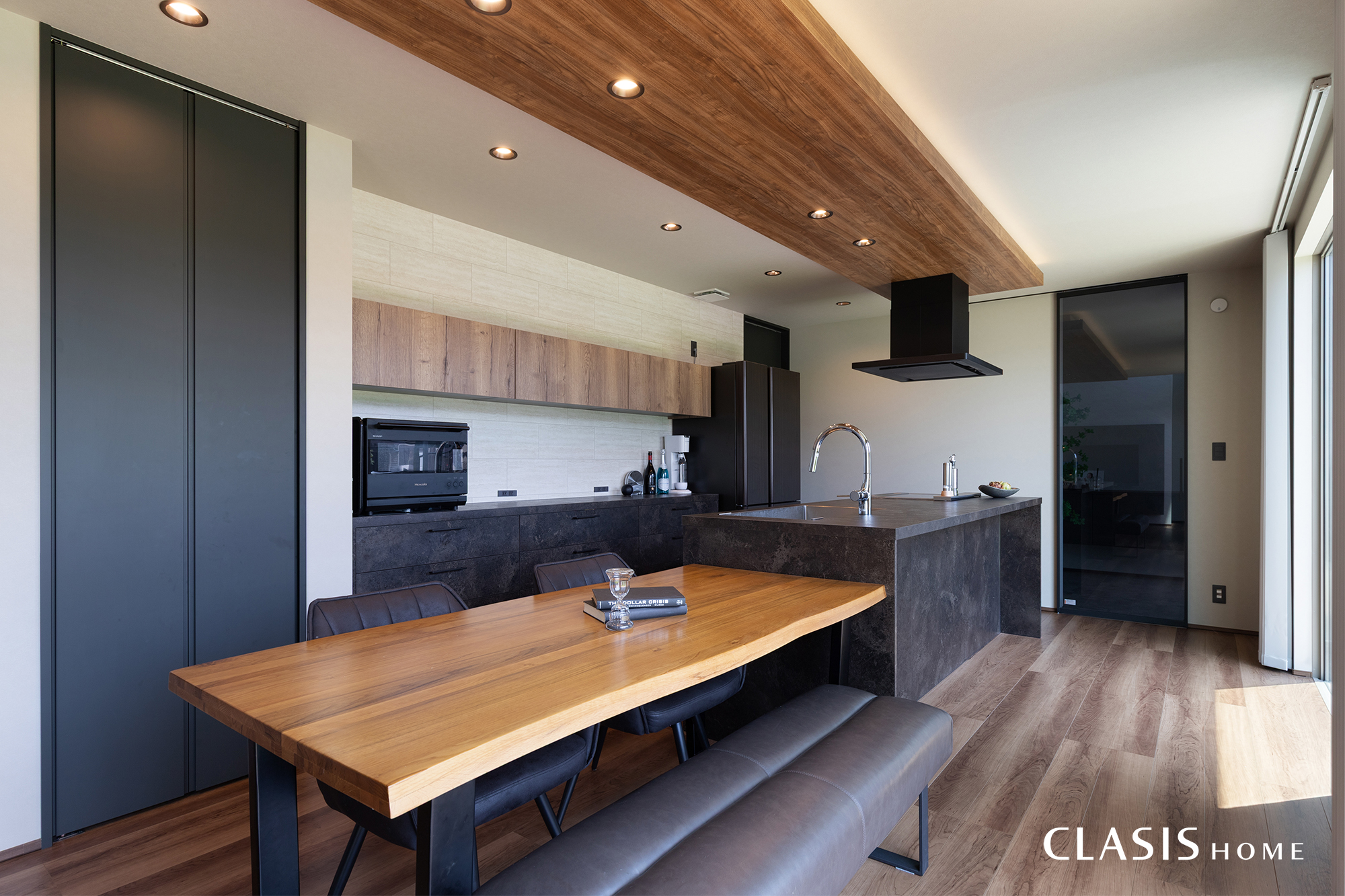 キッチンはグラフテクトのメルクリオ柄をセレクトしていただきました。折下げ天井には間接照明とダウンライトが仕込まれており、夜には昼間とは違った素敵な雰囲気を楽しめます。