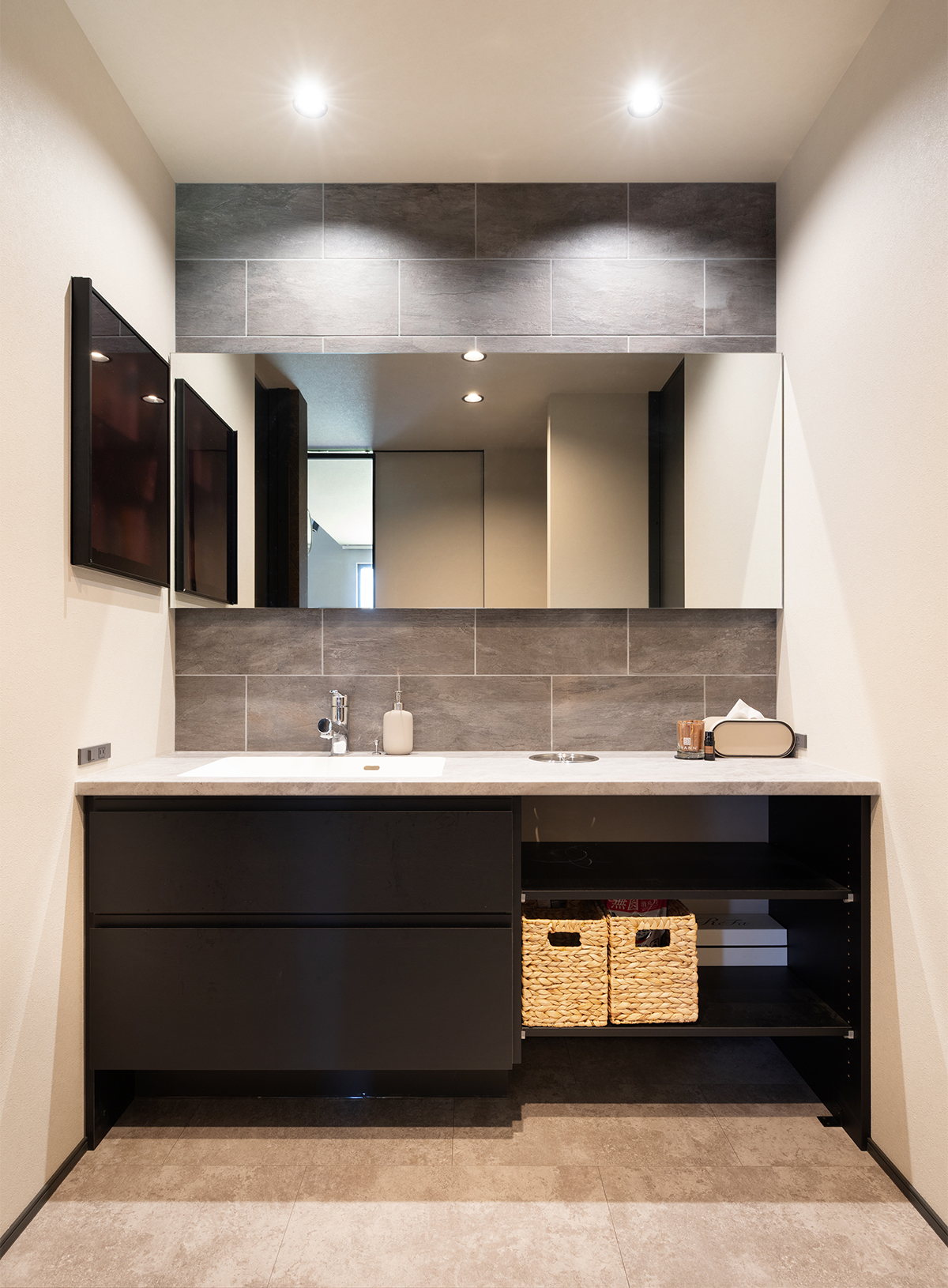 洗面は大判タイルや大理石調の天板などスタイリッシュなイメージにまとめ、サイドの壁面には埋め込み型のコスメキャビネットを設置しました。