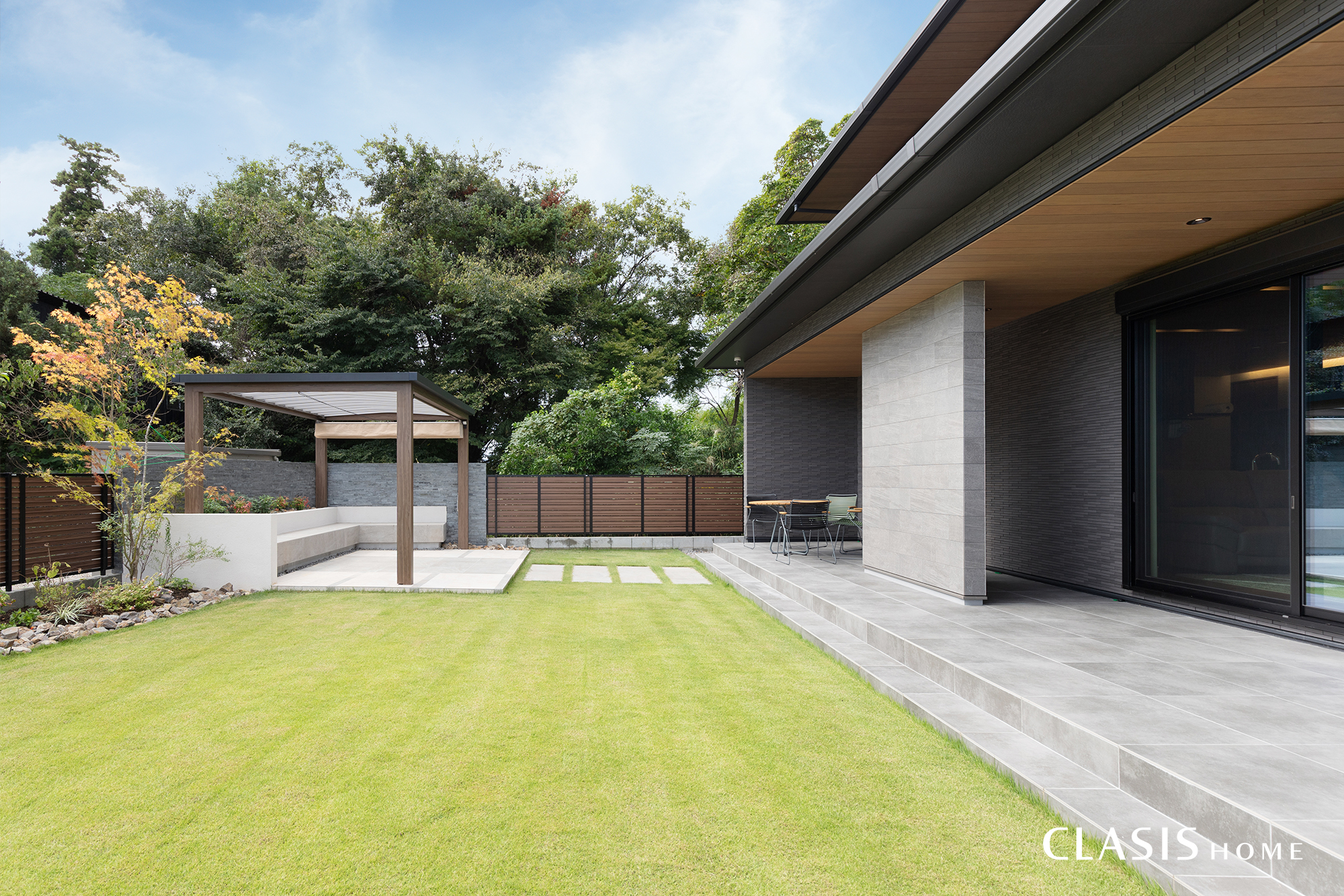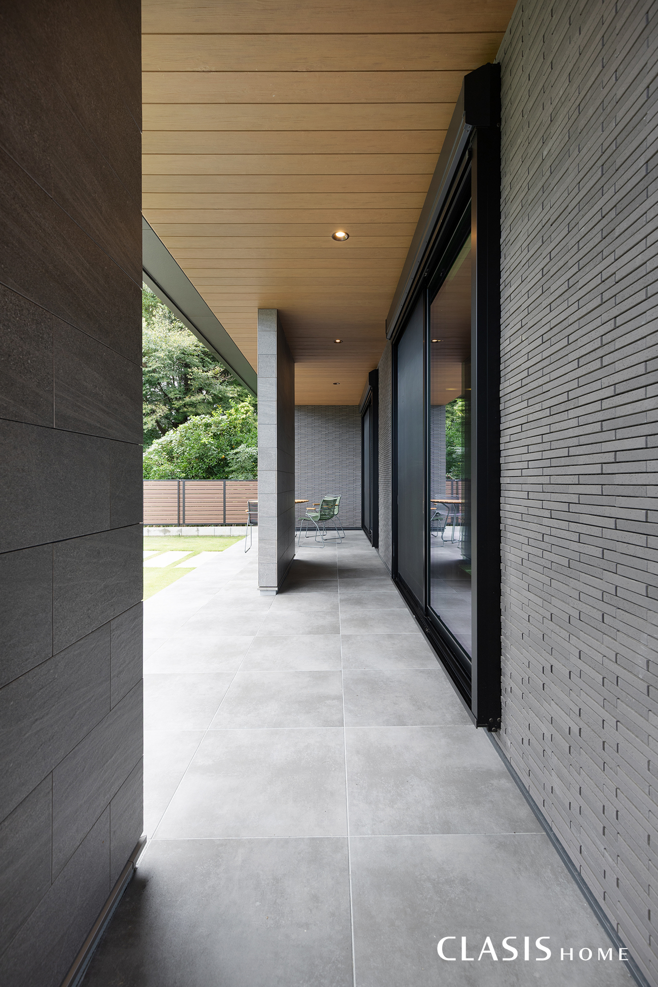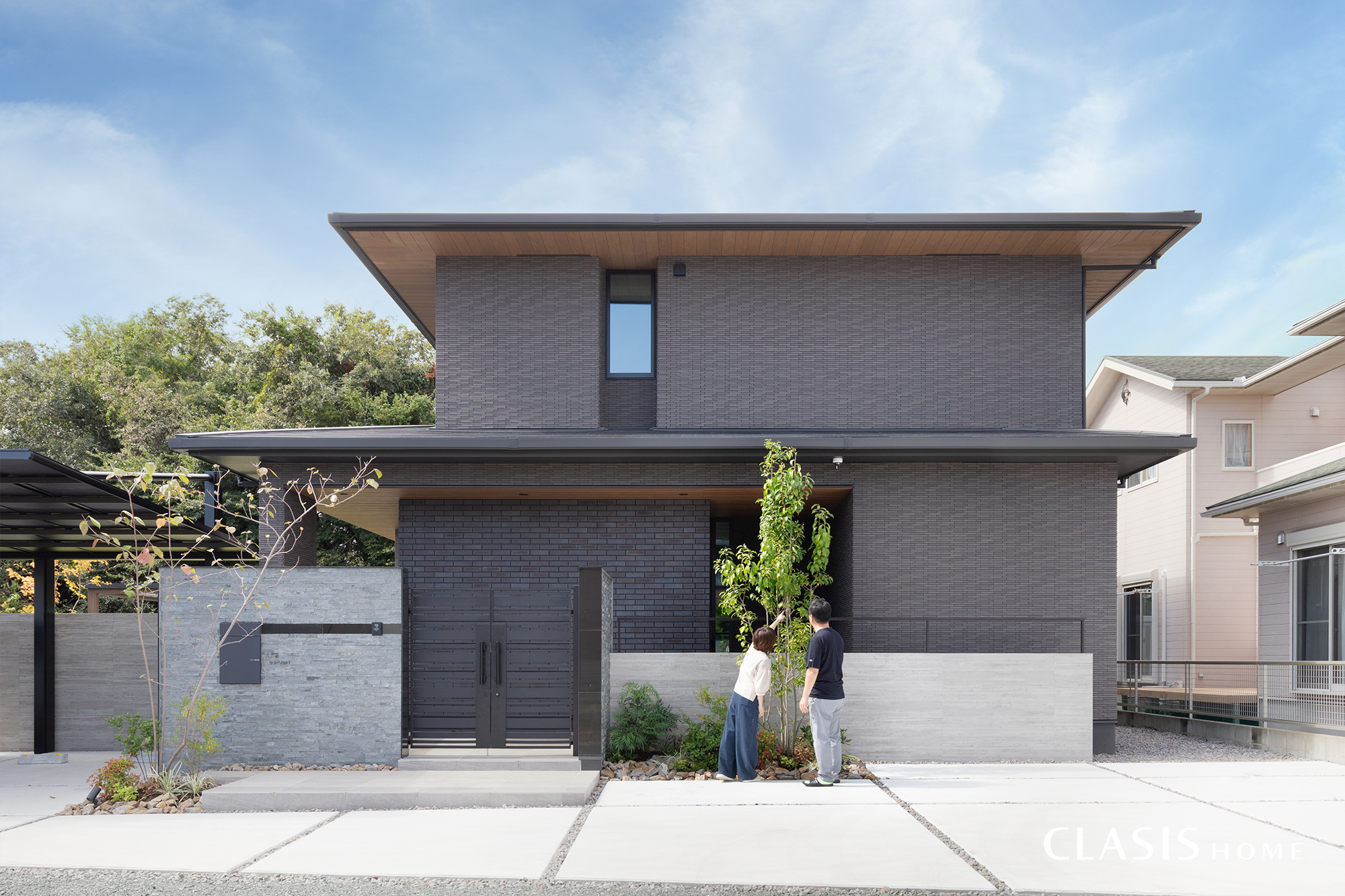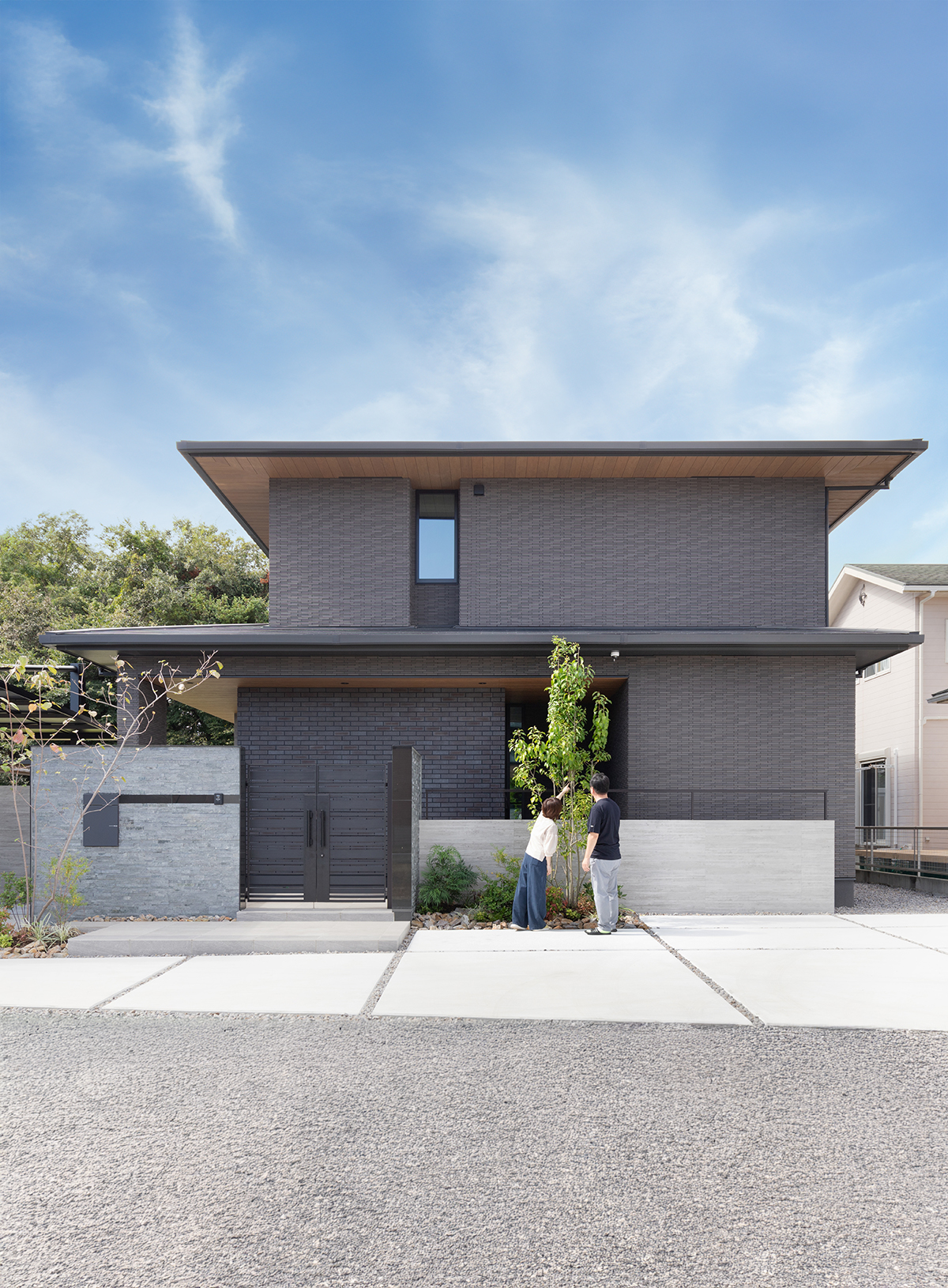チャコール系のタイルと、見る角度や日のあたりで偏光するブリック調タイルを玄関先にあしらった落ち着きのある外観。重厚感のある外観を際立たせるよう、軒裏は木目で仕上げています。