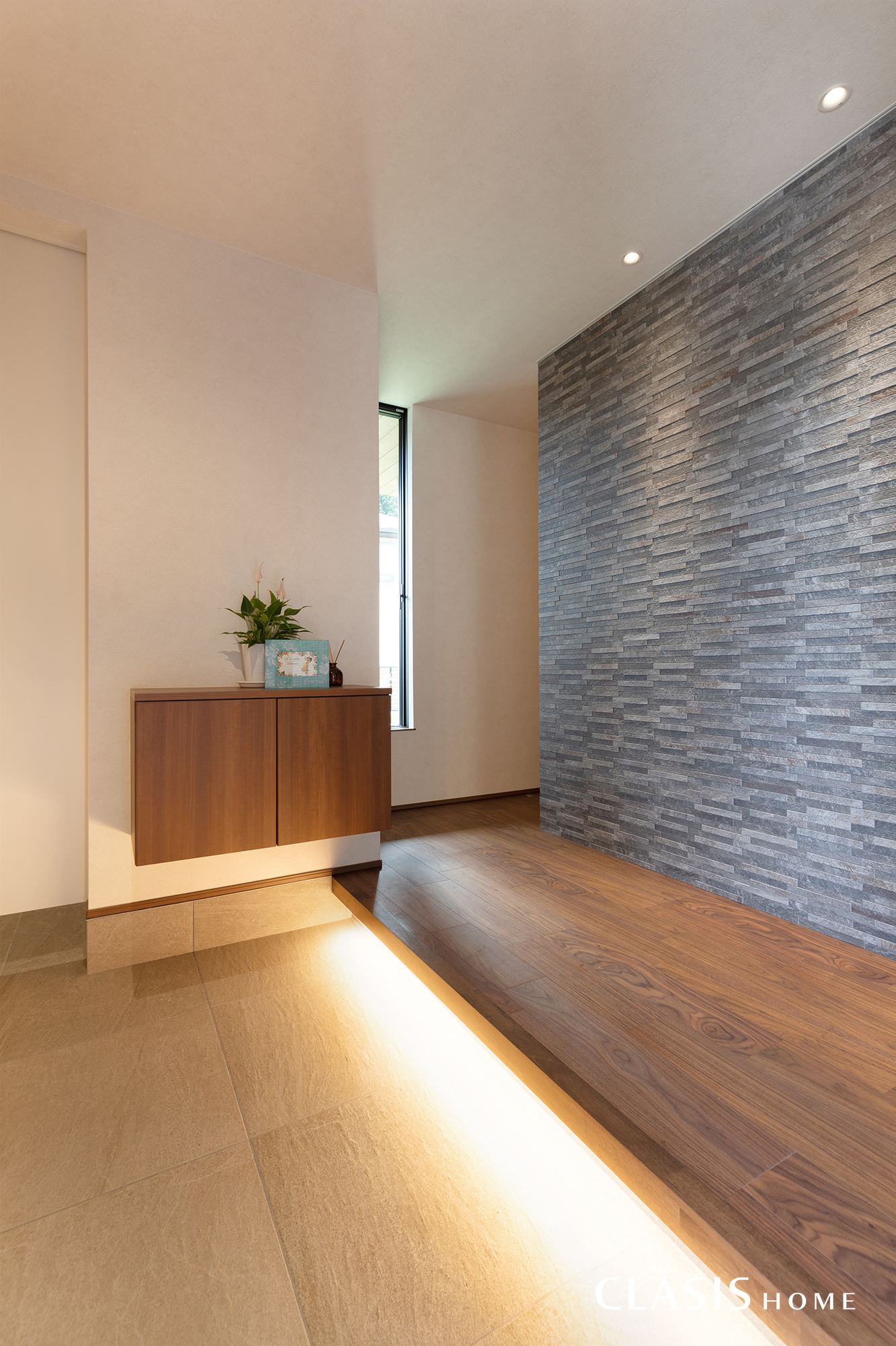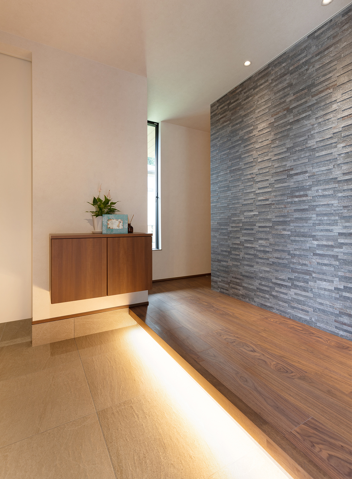 ウォールナットの床と相性の良い濃いグレーのエコカラットを正面に配置した玄関ホール。間接照明でエコカラットの質感を引き立てました。ゆくゆくは絵も飾れるようにピクチャーレールも設けています。