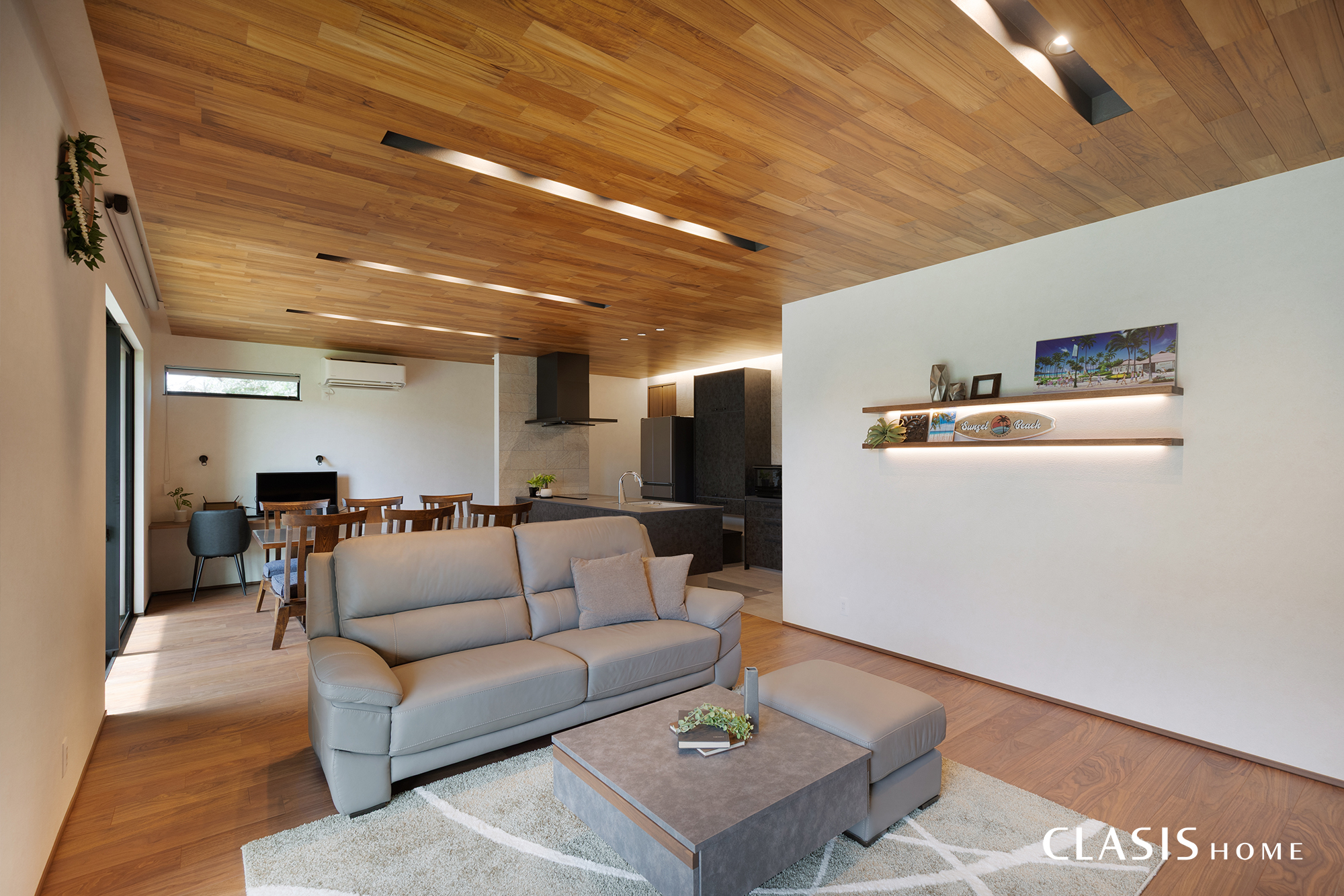 床材にウォールナットの突板、壁には石目調の淡いグレーのクロスを用いたLDK。天井にはチークの羽目板を使用し、天然の木目が持つ風合いを取り入れています。