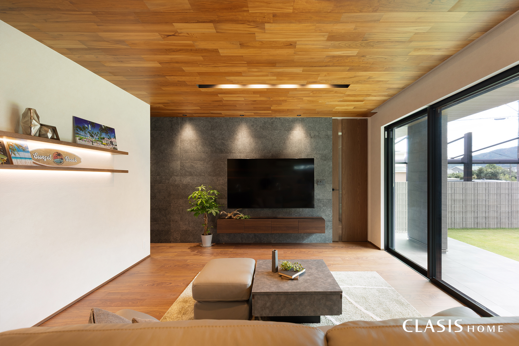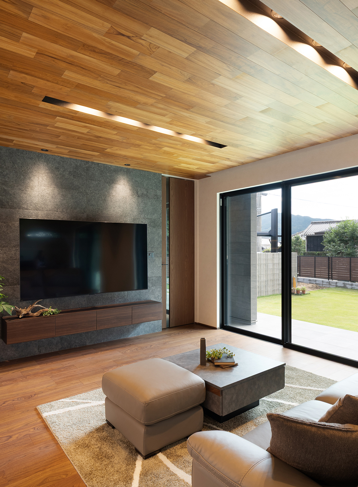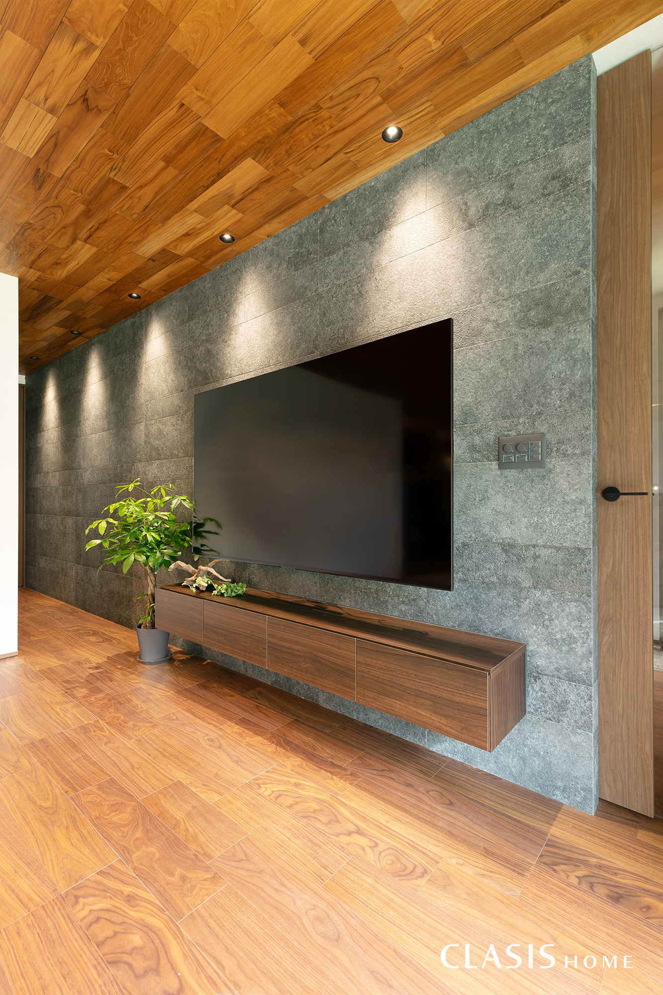 一面にエコカラットを採用したテレビ壁。リズミカルに並べられた照明が奥行き感を際立たせています。