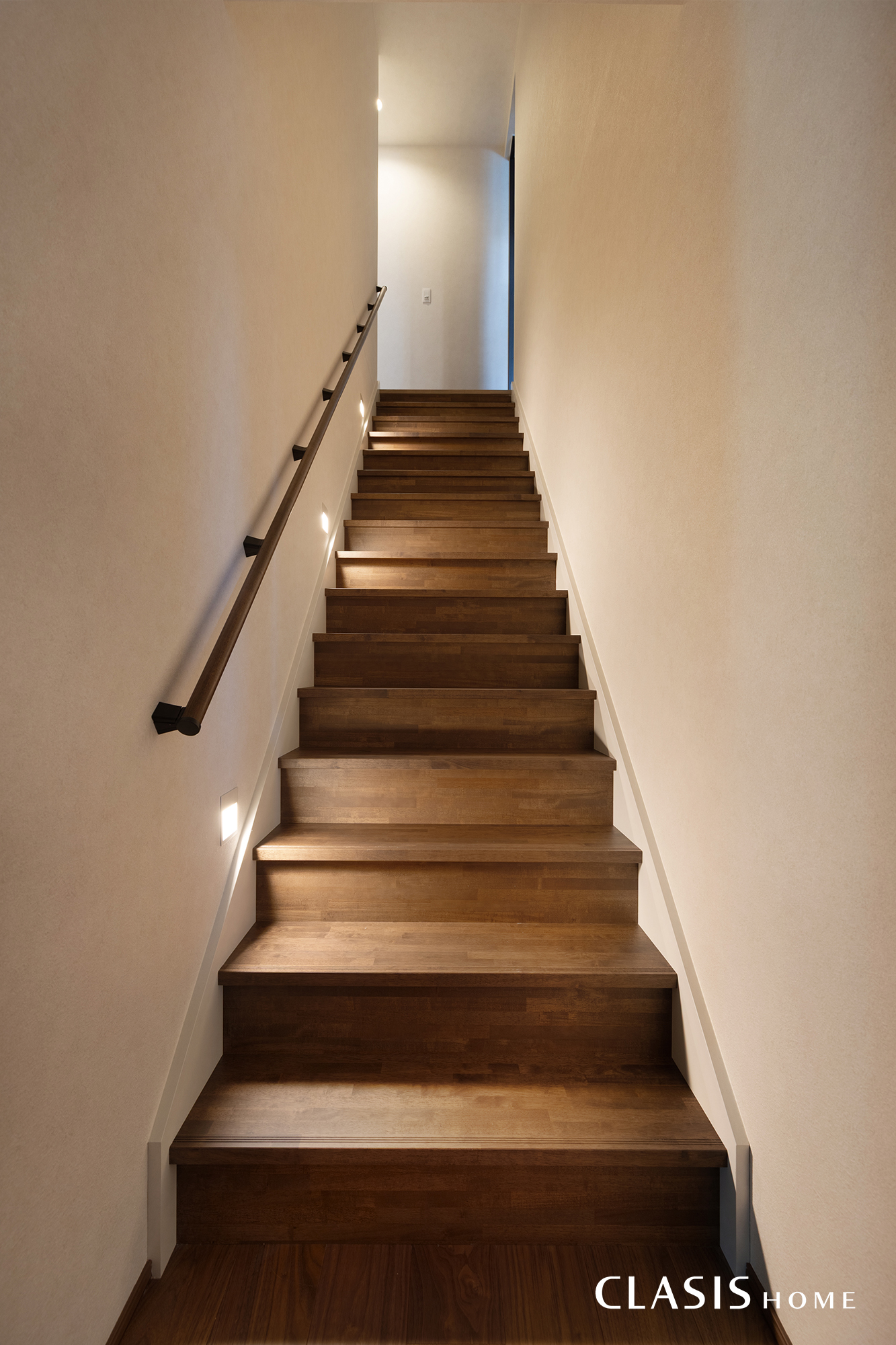 幅が広くゆとりのある階段には埋め込み式の照明を配置し、広さをより際立たせています。