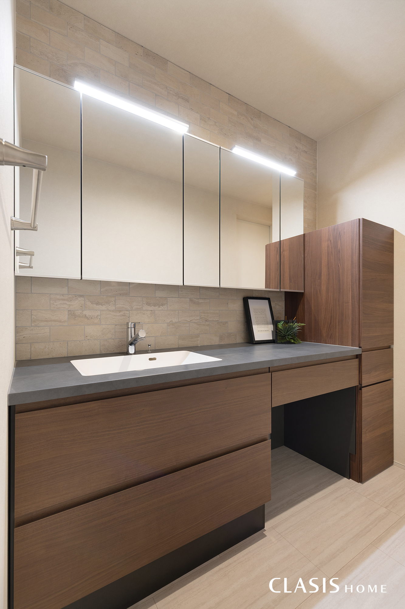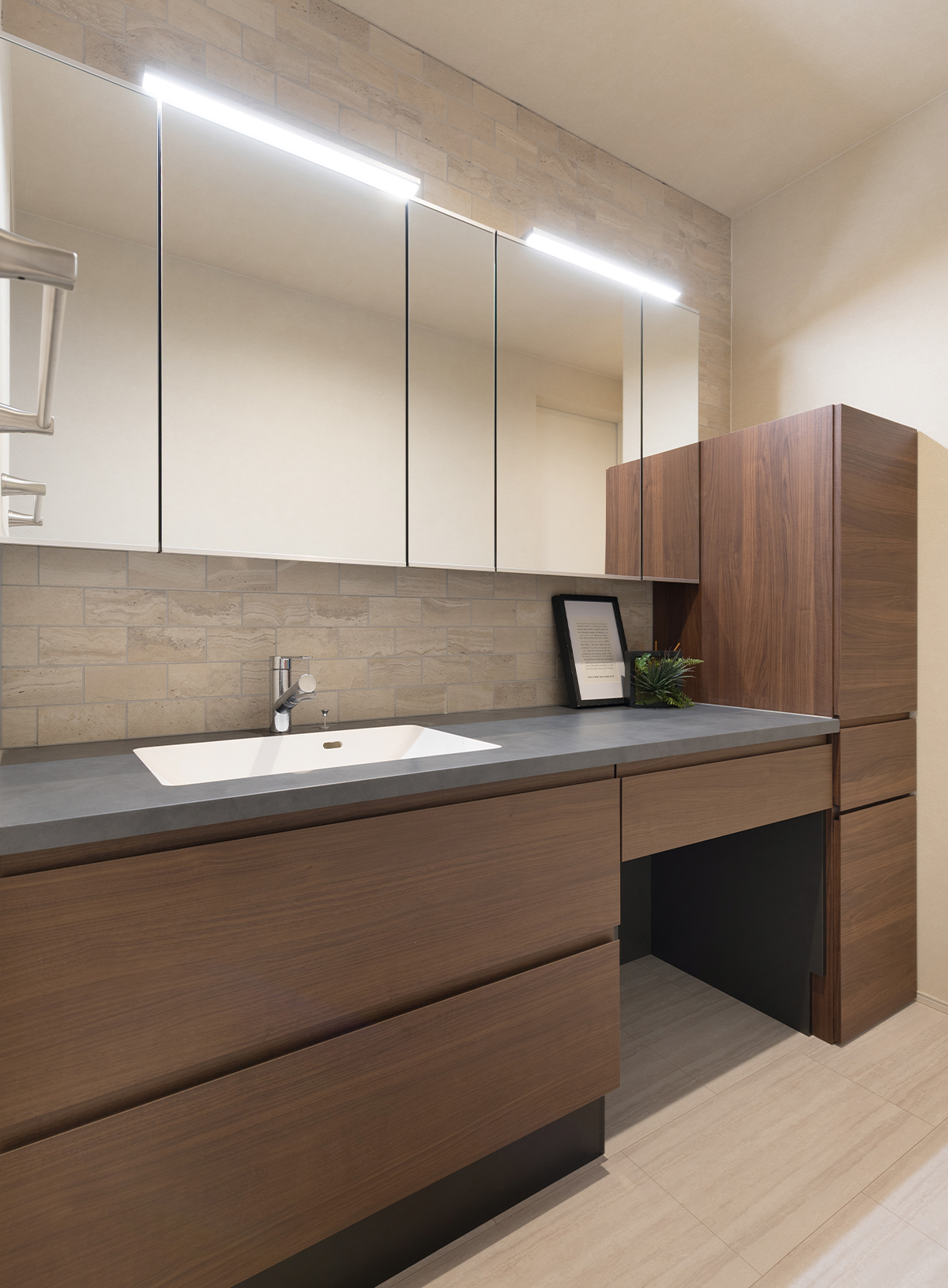 洗面台にはLDKと同様に、木目調のタイプのものをセレクトし、優しい雰囲気に。生活導線を考え、洗面横にはタオルや備品を入れることの出来る収納を採用しました。