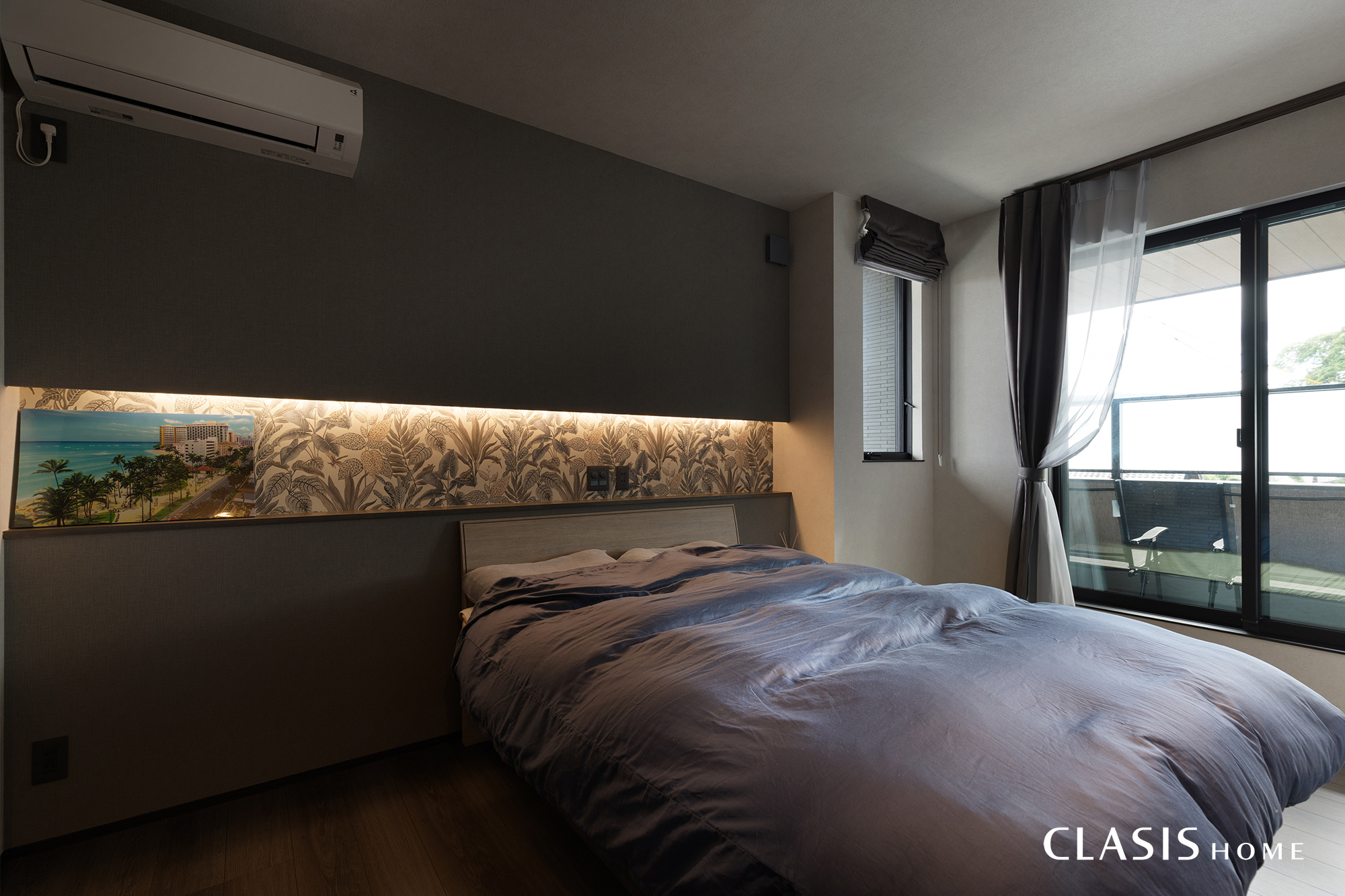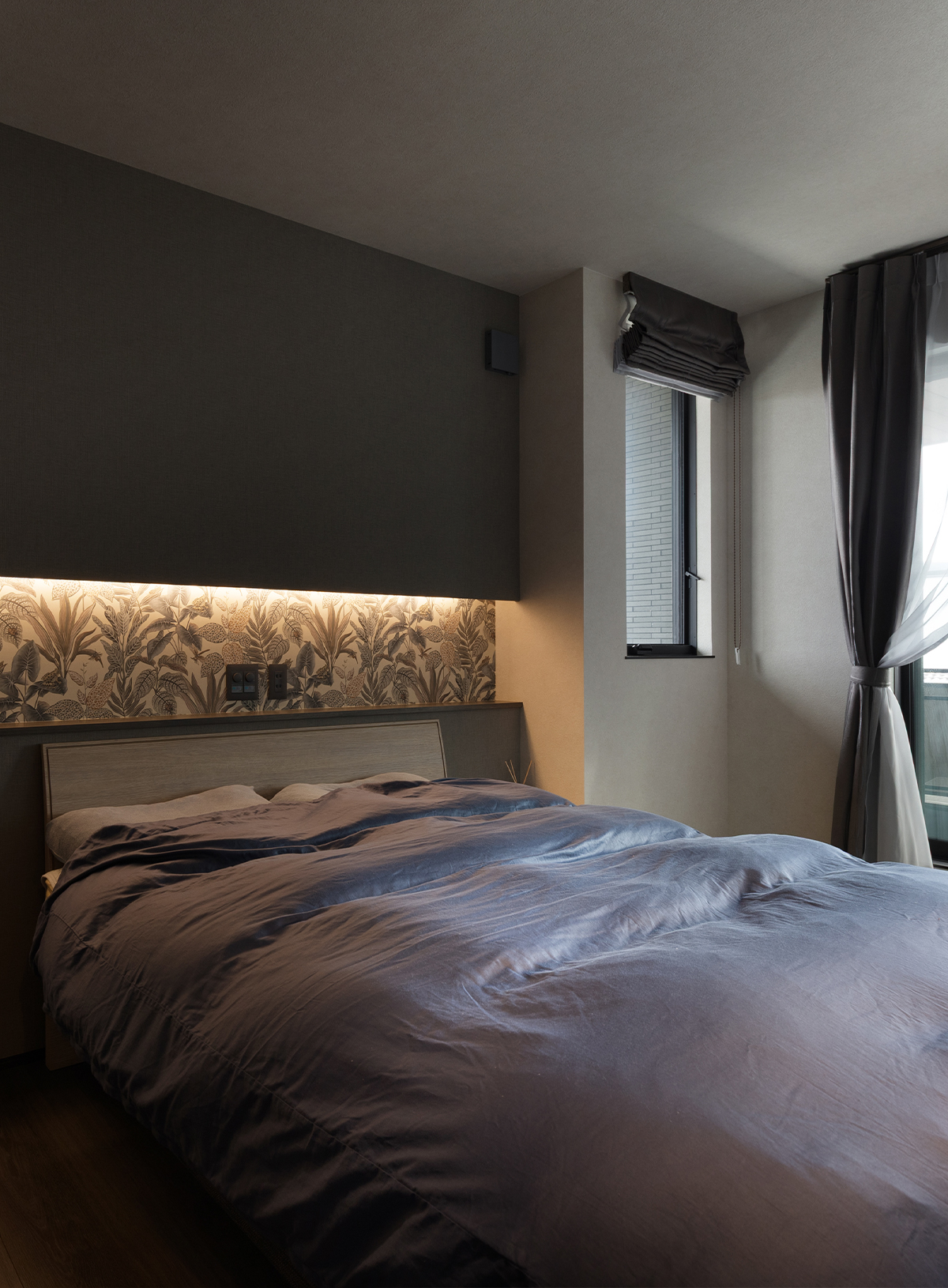 就寝時に枕元に物を置く事が出来るよう、ニッチを作成しました。重心を下げた間接照明を採用する事で、眩しくなりすぎないようになっています。ニッチのアクセントクロスは奥様のお気に入り。