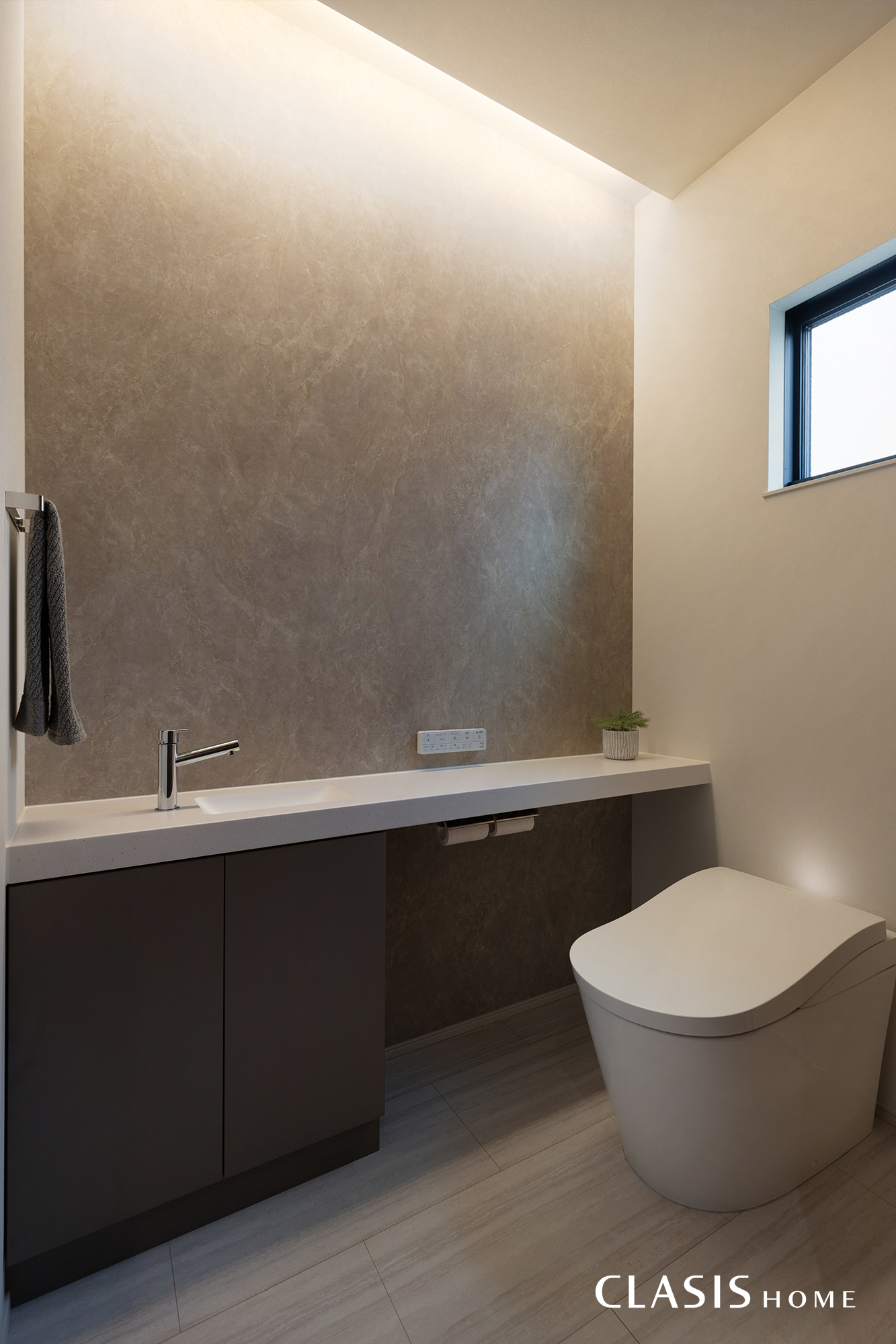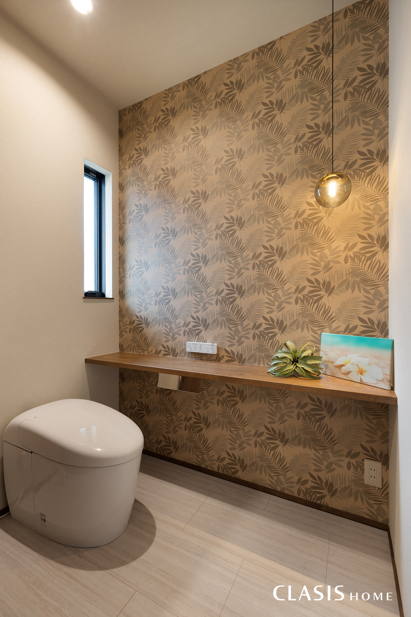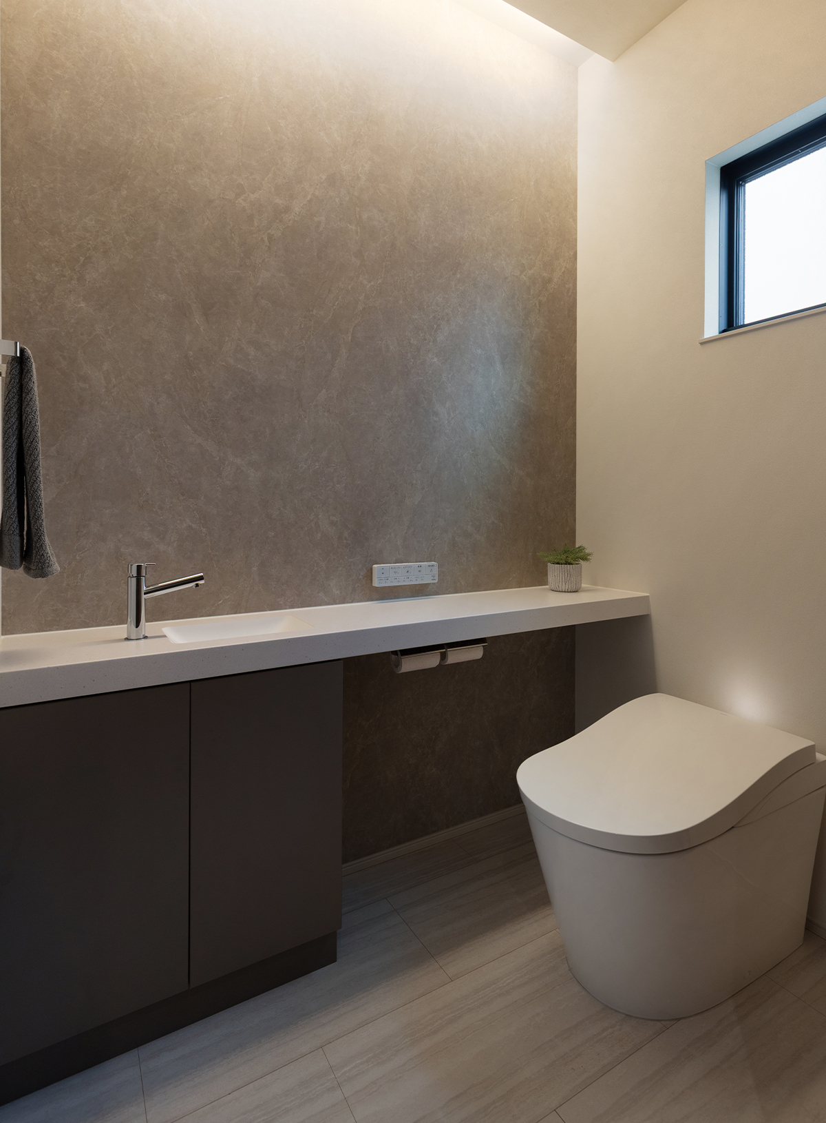トイレには、旅行気分をいつでも味わう事が出来るよう、リゾートの雰囲気を残しました。色味もブラウン系で統一しています。