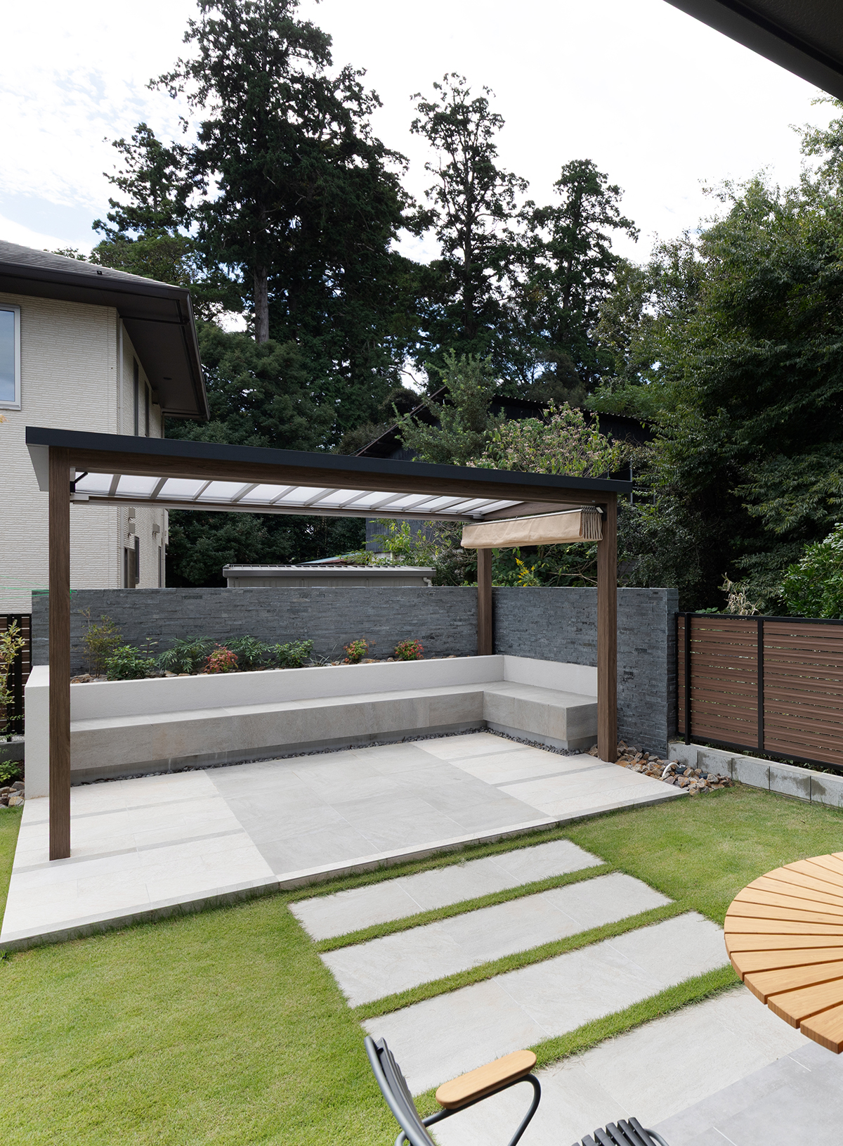 お庭の延長景色として隣地の森を取り込む事で開放感を持たせました。春にはウグイスのさえずりも聞こえ、四季を感じられるアウトドアリビングです。