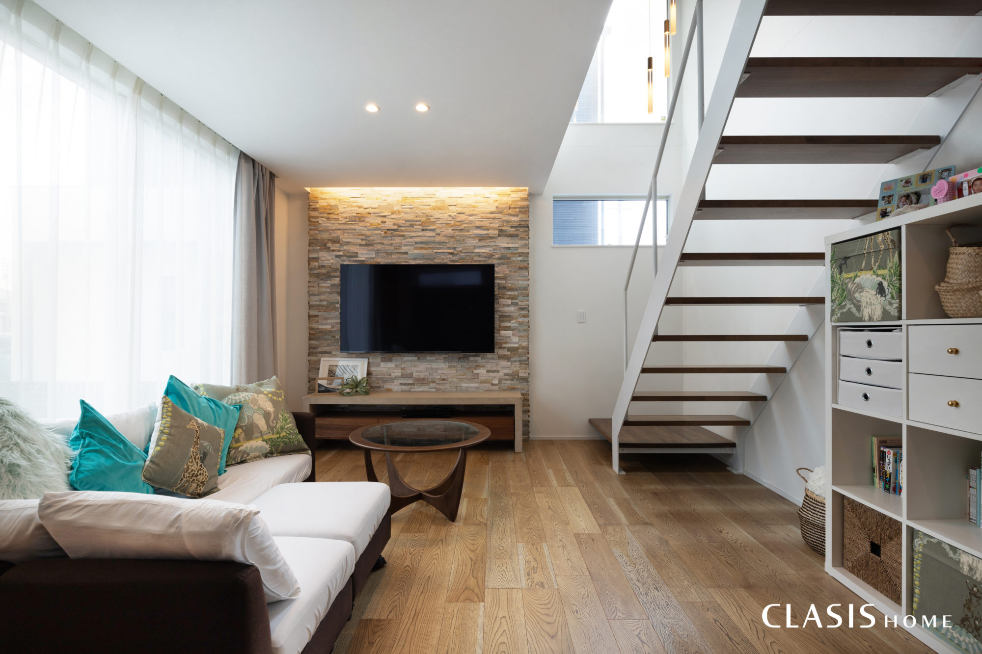 リビングは、エイジング加工された無垢材や天然石のタイルを使用して、リゾートのコテージのようなイメージを持たせました。