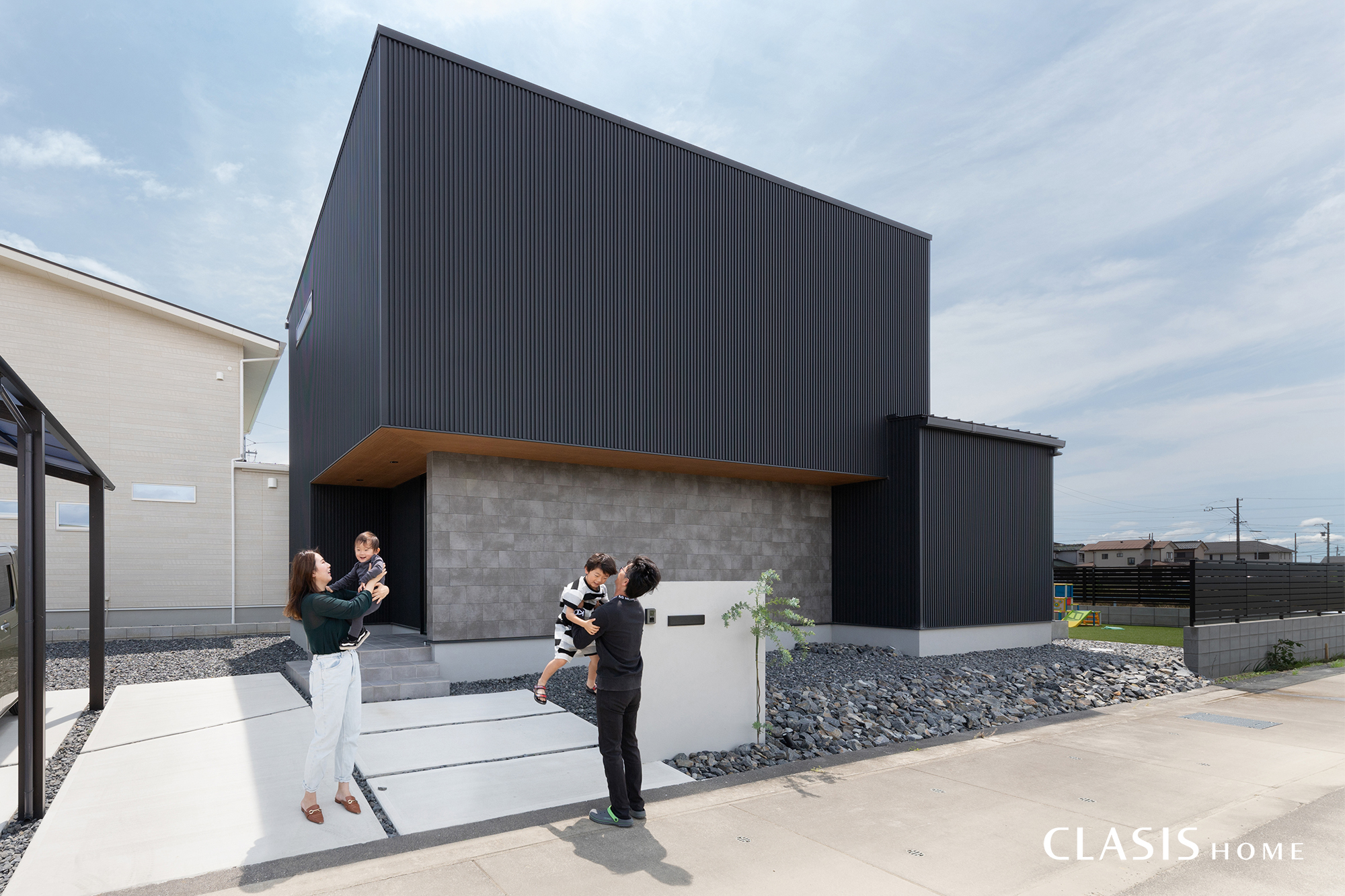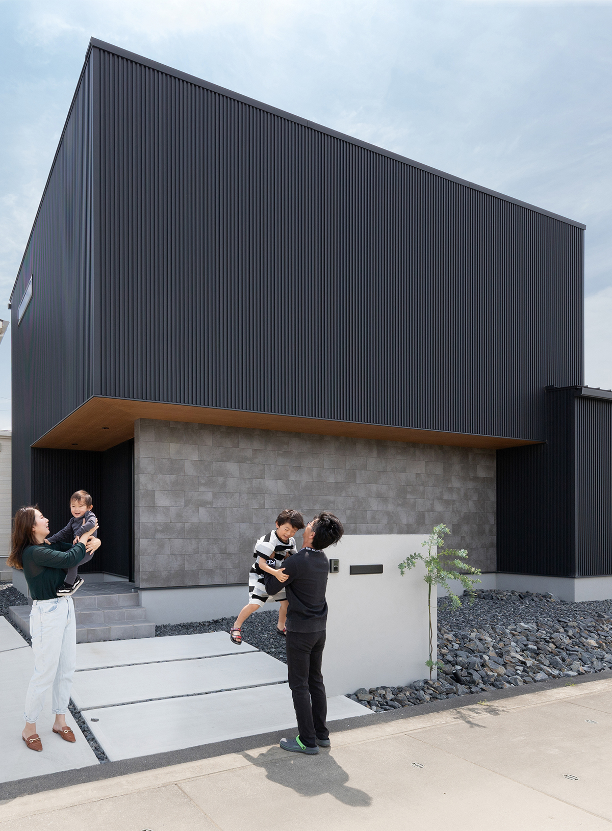 広い間口の敷地に合わせて、外観は直線的なデザインを意識しました。BOXを重ねたようなシルエットにすることで、シンプルな中にも洗練されたイメージを加えています。