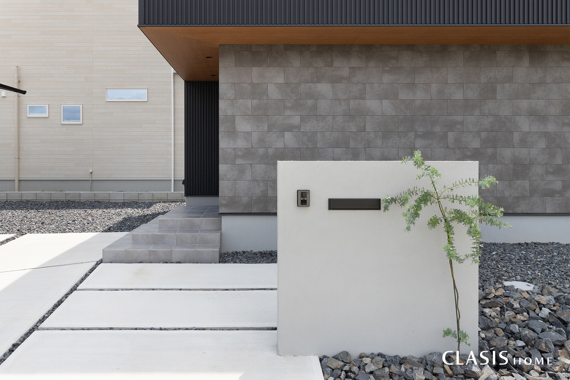 外壁にはガルバリウム鋼板とタイル、軒天に木目を組み合わせることで素材感や色味にコントラストを生み出しました。