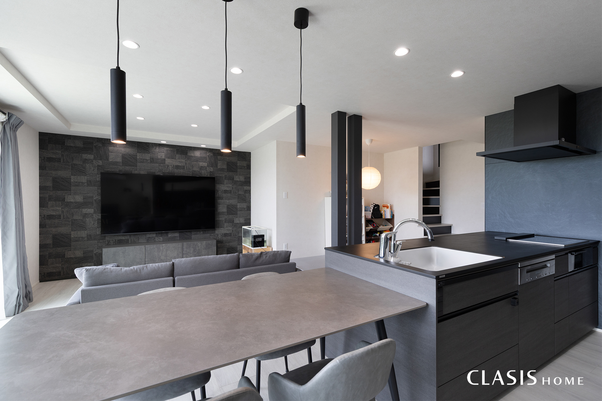 開放感を高めるために空間を広く使い、クロスや床材のベースは白系を選びました。逆にインテリアの主役であるキッチンやアクセントになる部分はグレー・ブラック系の色味にまとめるとで高級感を高め、生活感を感じさせないホテルライクな雰囲気を演出しています。