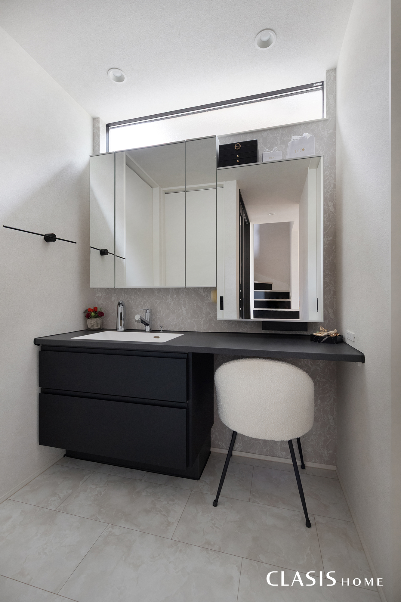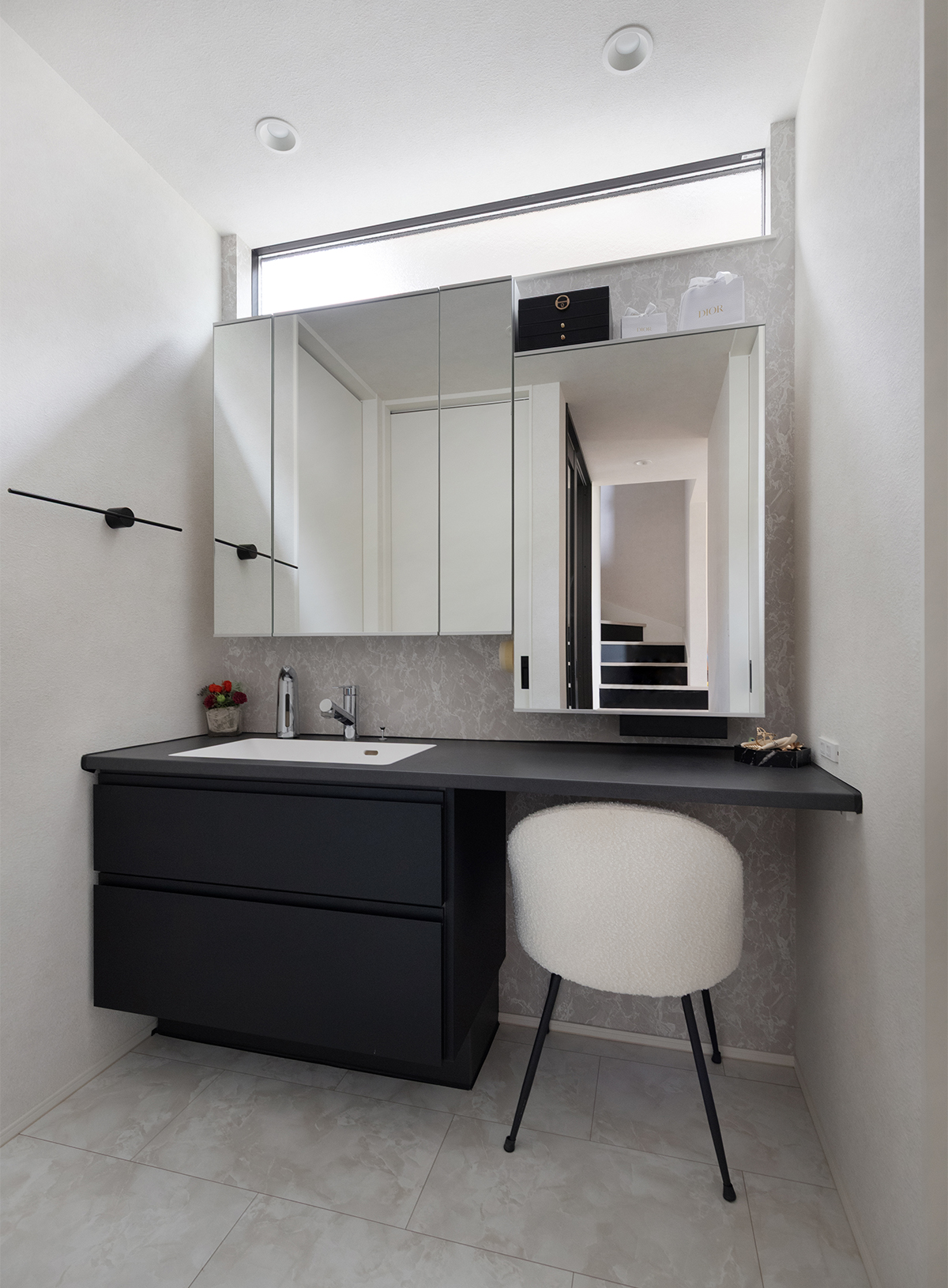 清潔感と高級感が感じられるホテルライクな洗面台。お化粧がしやすいように右側の1面鏡のみを少し低めに設置しました。利便性を高めつつ遊び心も感じられるデザインです。
