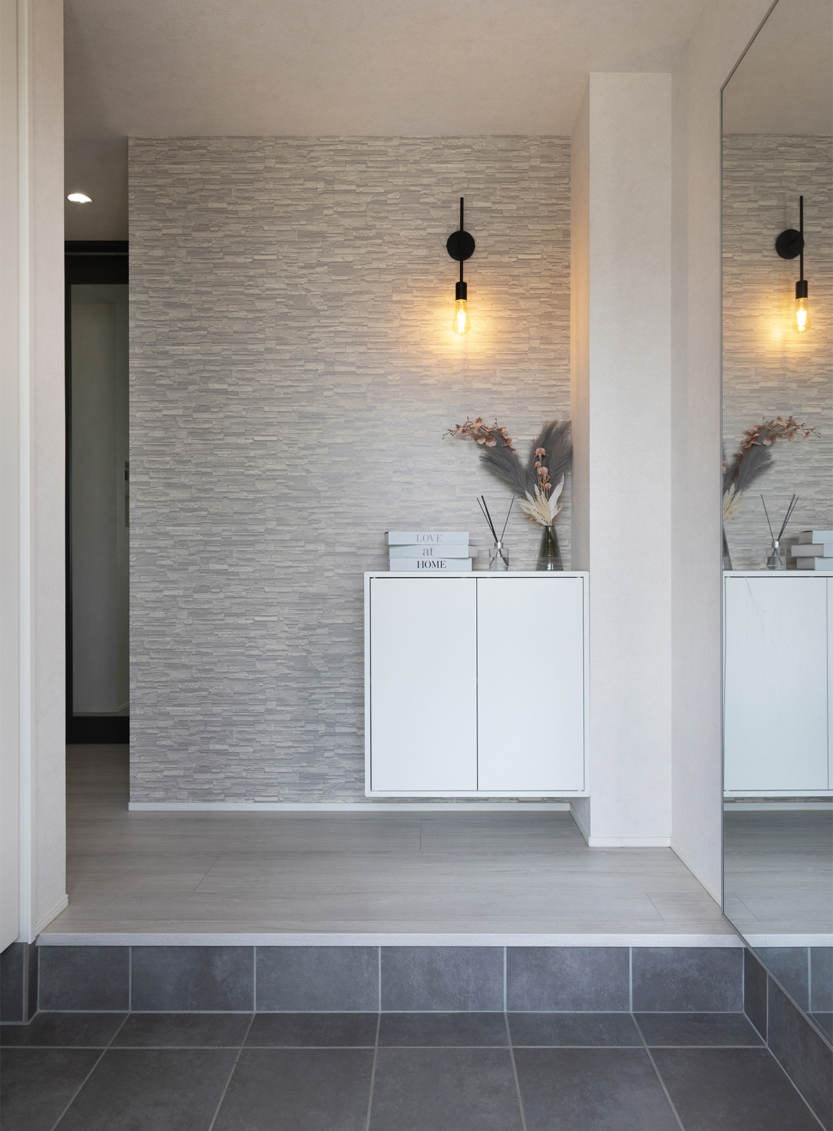 玄関はコントラストを抑えてシンプルでモダンな印象に。リアルな質感の石目調のアクセントクロスで雰囲気を高めています。