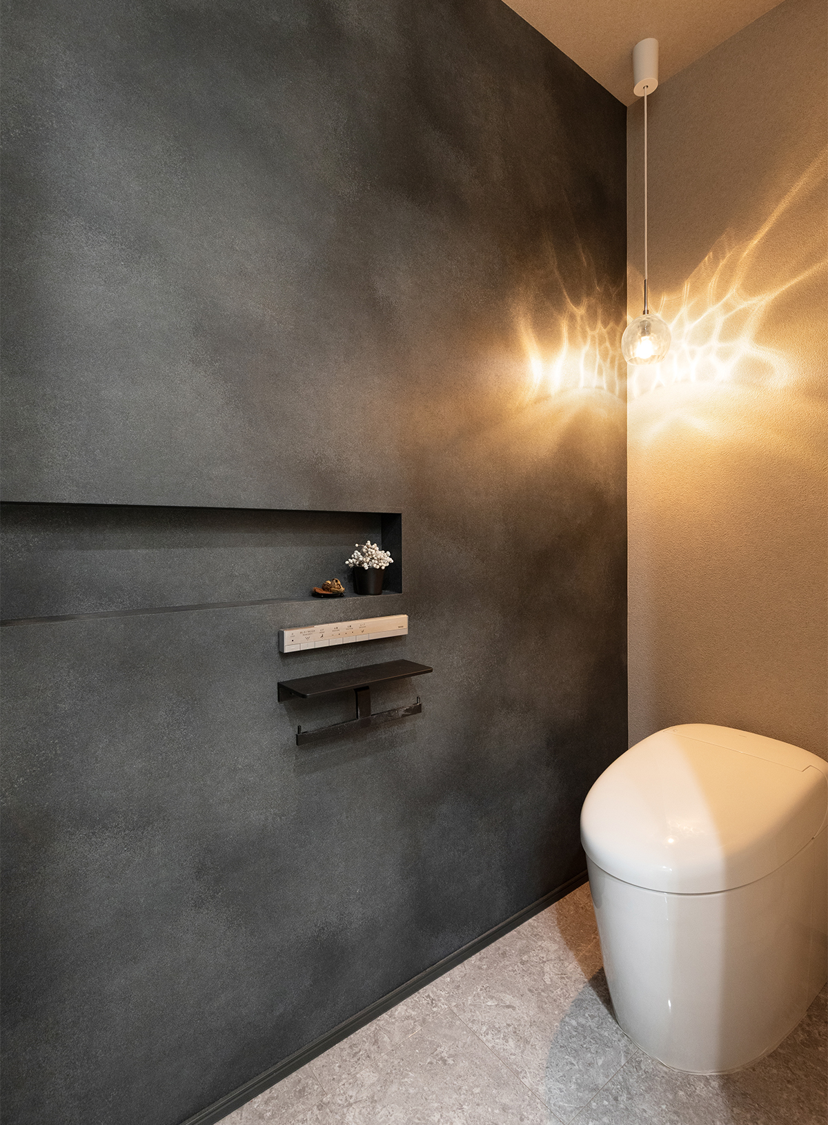 トイレ内は白色を使わずにダークグレー、ライトグレーを組み合わせてコーディネートしました。ペンダントライトの光の陰影が印象的です。