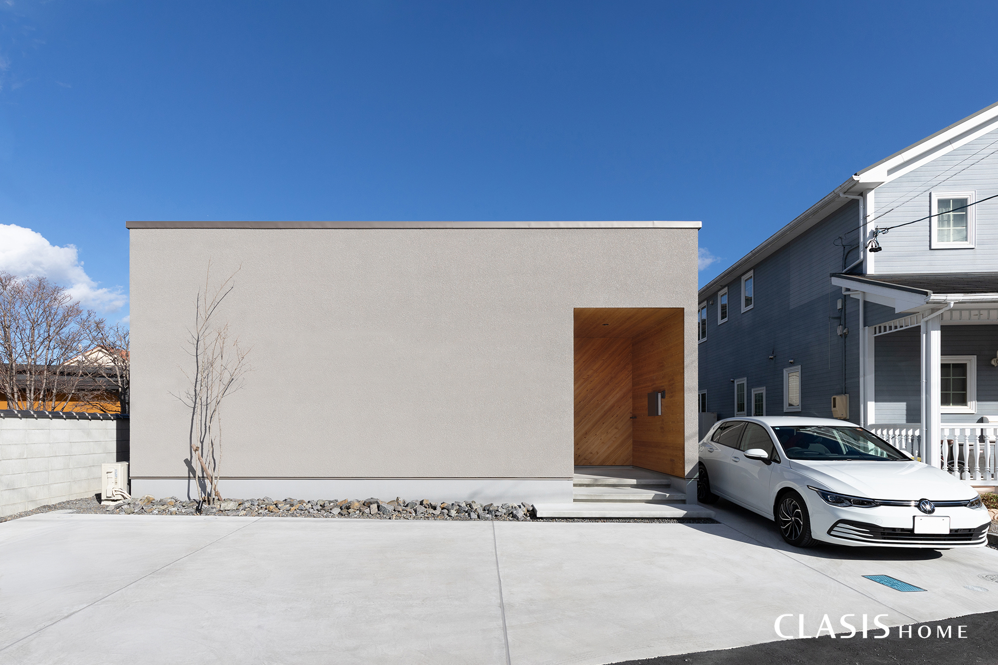 グレーの塗り壁を基調としたBOX型の外観。落ち着きのある佇まいが、個性を放つデザインです。