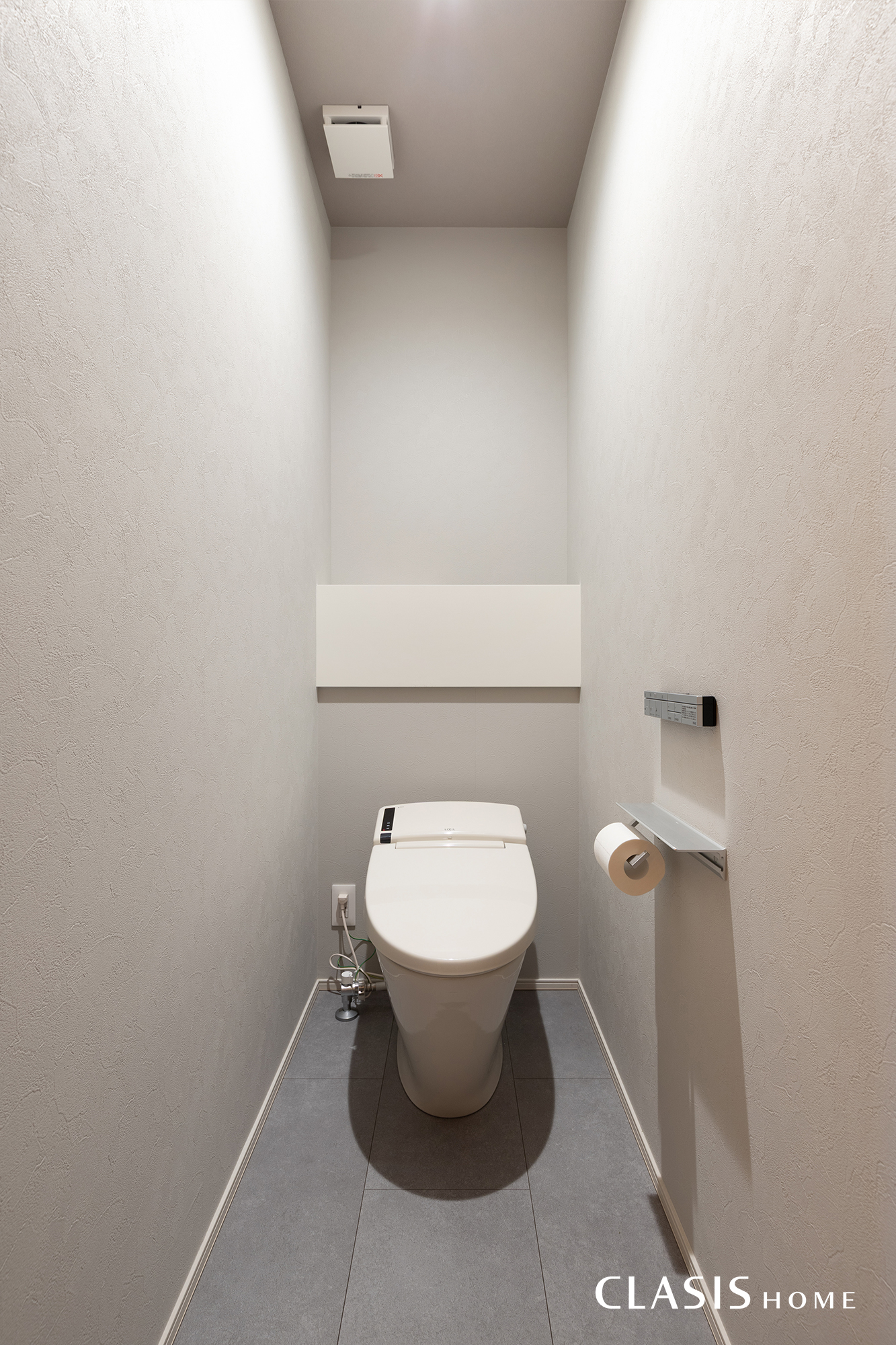 トイレ空間は白とグレーを基調に清潔感のある空間にまとめました。背面のパネルは収納になっており、壁面のアクセントとしつつ、収納力も確保しています。