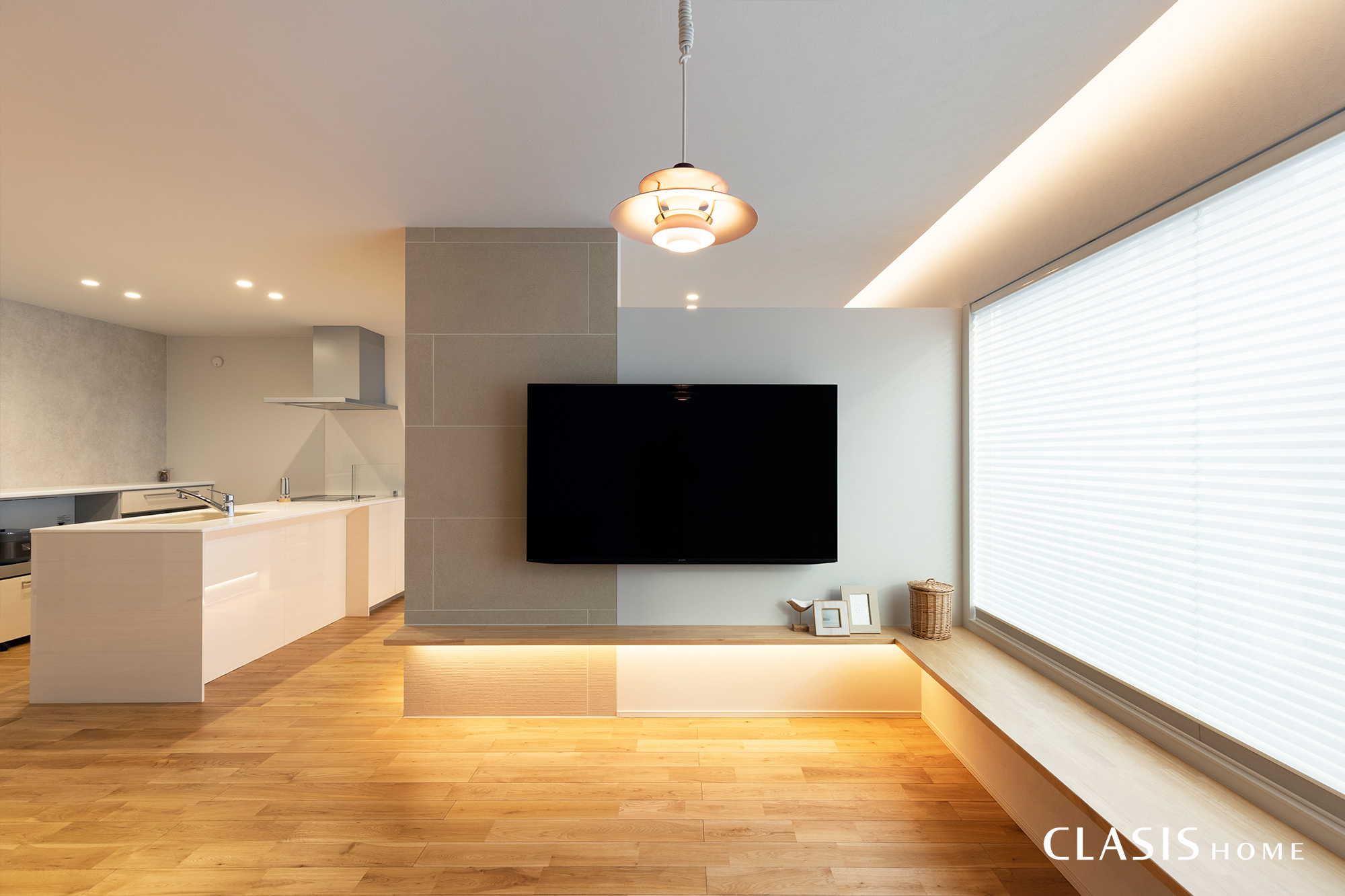 テレビ下から窓際へと続く造作カウンターは、腰掛けられるベンチとしても活躍します。テレビ下部のカウンターとラインを繋げることで、視覚的な一体感を演出しました。