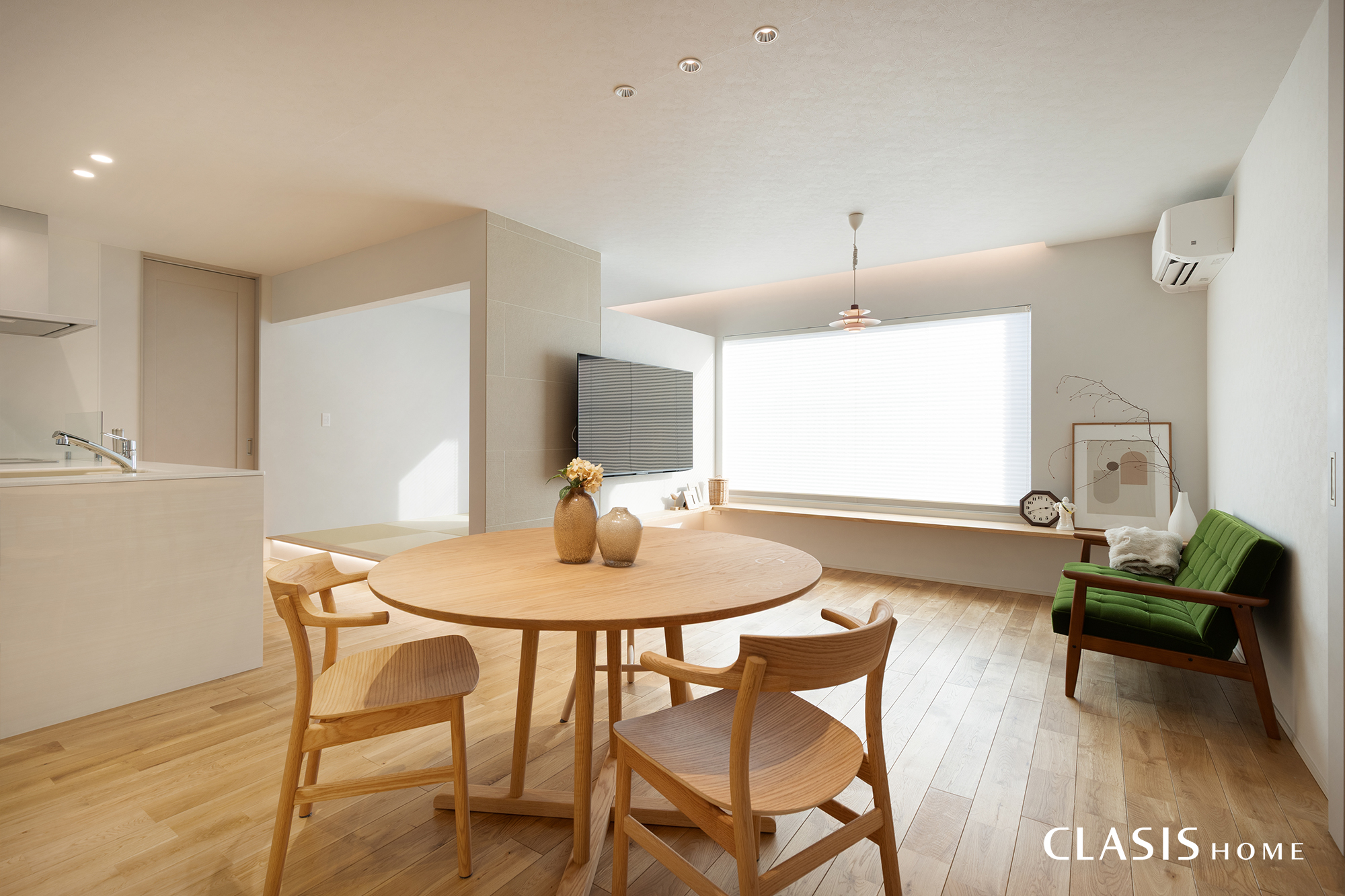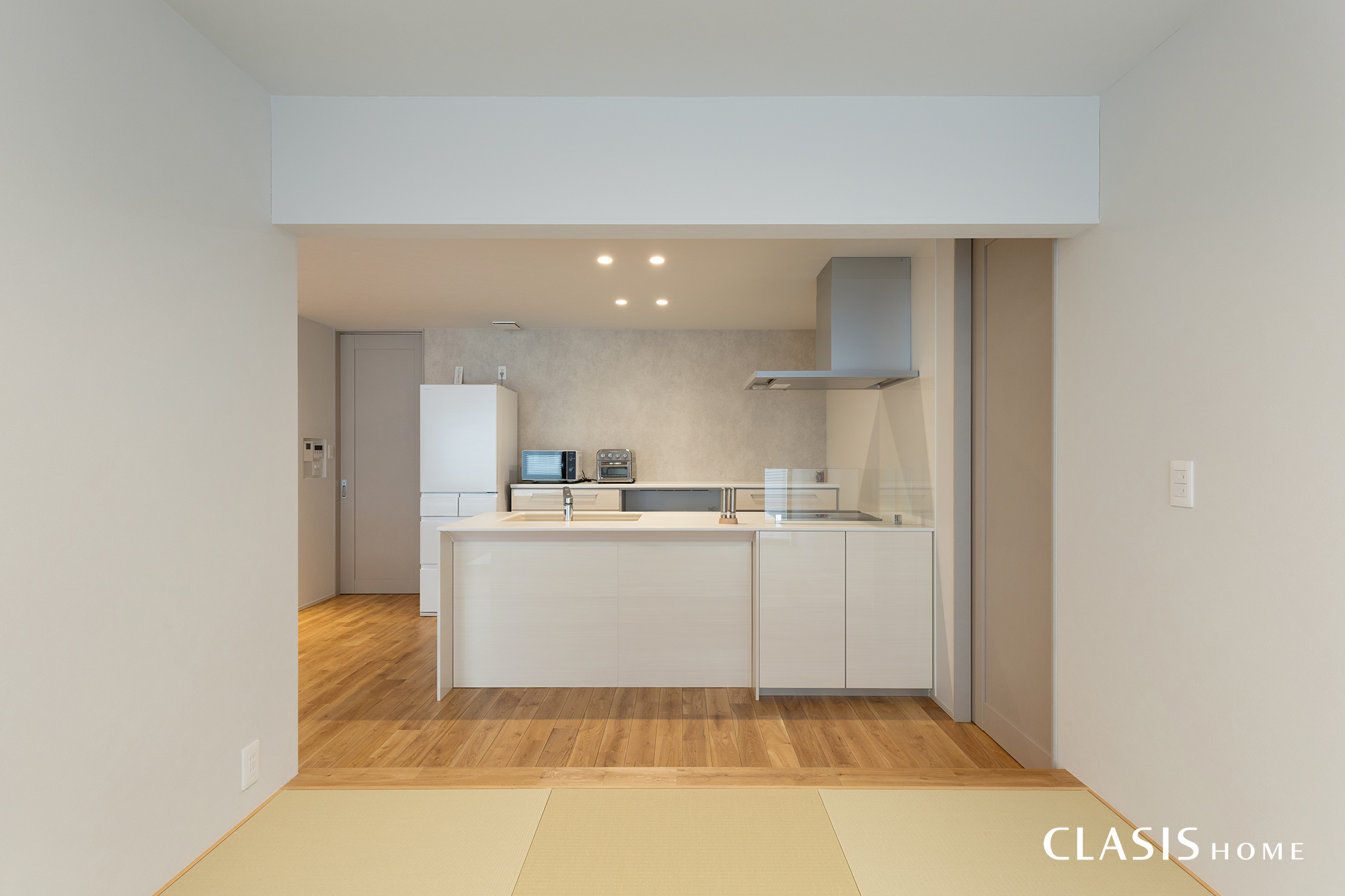 下がり壁を設けることで、LDKと和室をやさしく区切り、落ち着いて過ごせる空間に仕上げました。