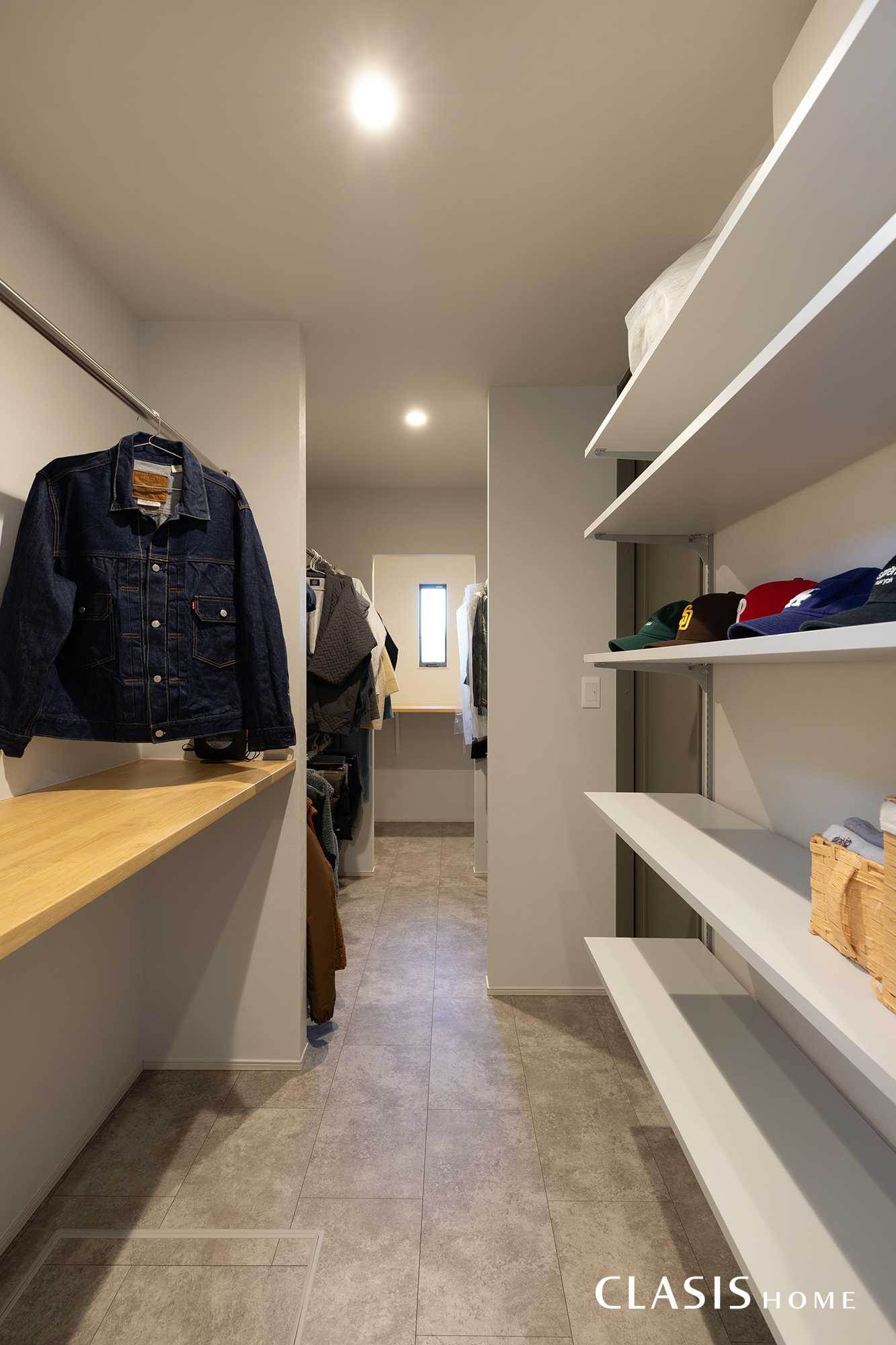 家族全員の衣類をまとめて管理できる、広々としたファミリークローゼット。造作のカウンタースペースを設けることで、「アイロンを掛けて、その場で畳んで収納する」という一連の家事動線がこの一室で完結します。暮らしの効率とゆとりを生み出す機能的なスペースです。